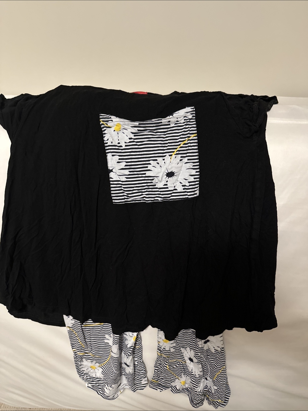 A comfy and stylish black pajama set! The top features a cute pocket with a striped and floral design, and the pants match with the same pattern. Perfect for a cozy night in
