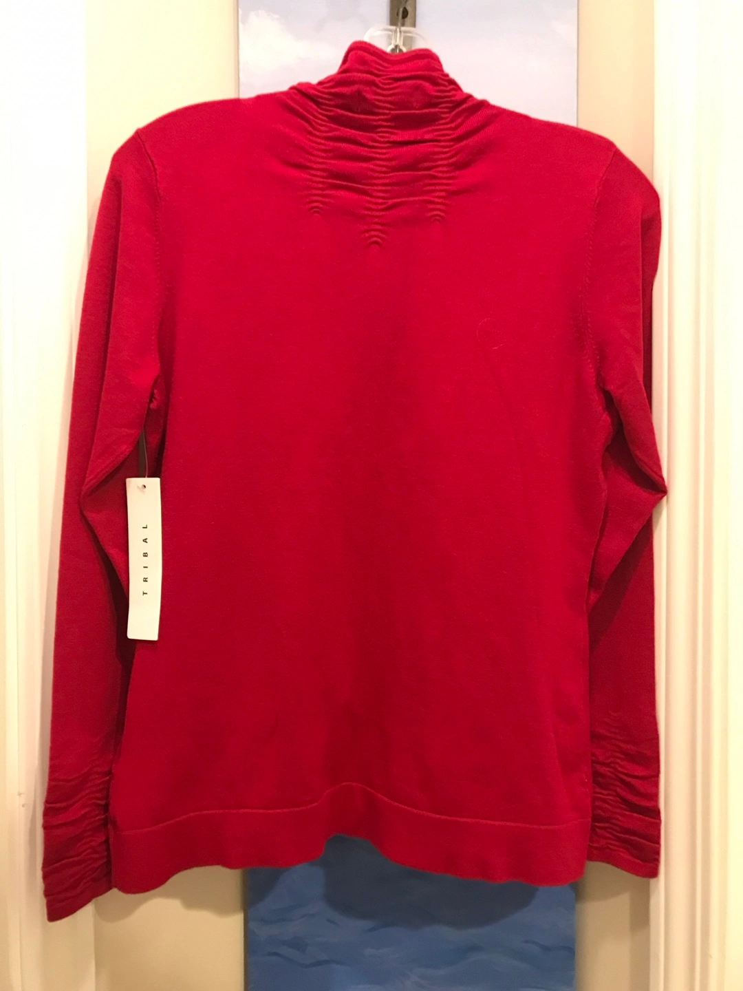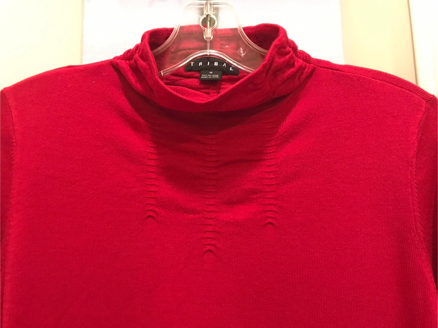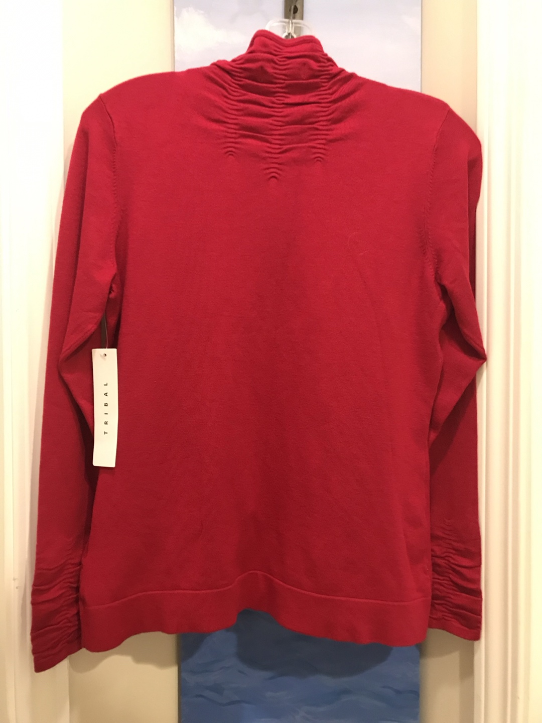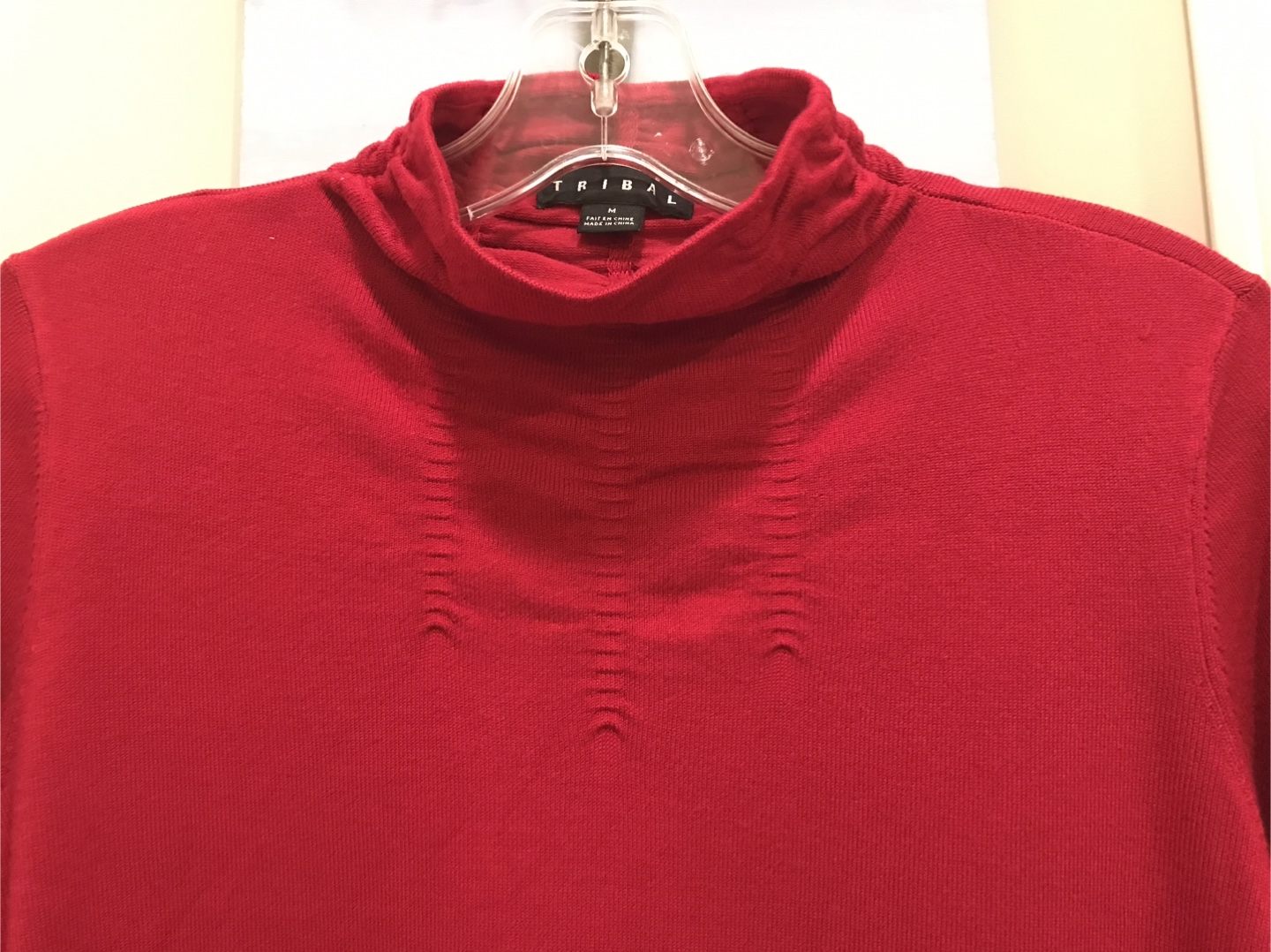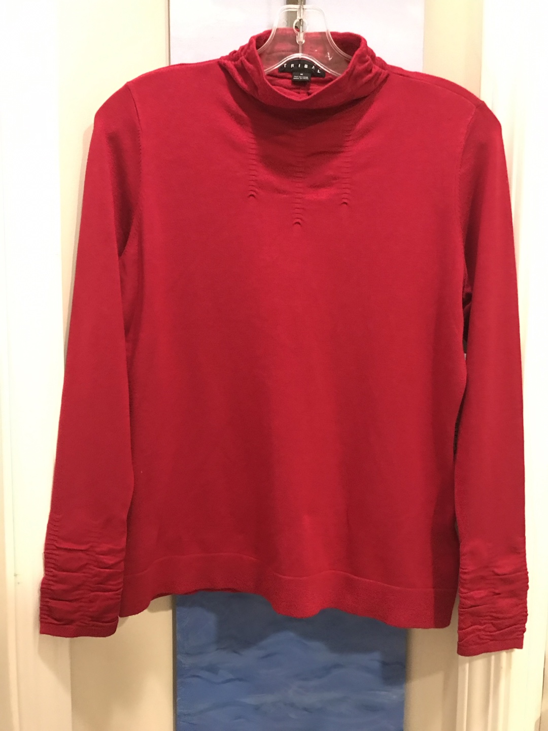 This is a lovely designer Tribal brand turtleneck in a cranberry red colour. It's a size medium and made of 72% rayon and 28% nylon. Size MEDIUM but can also fit small. ORIGINAL TAGS still attached.