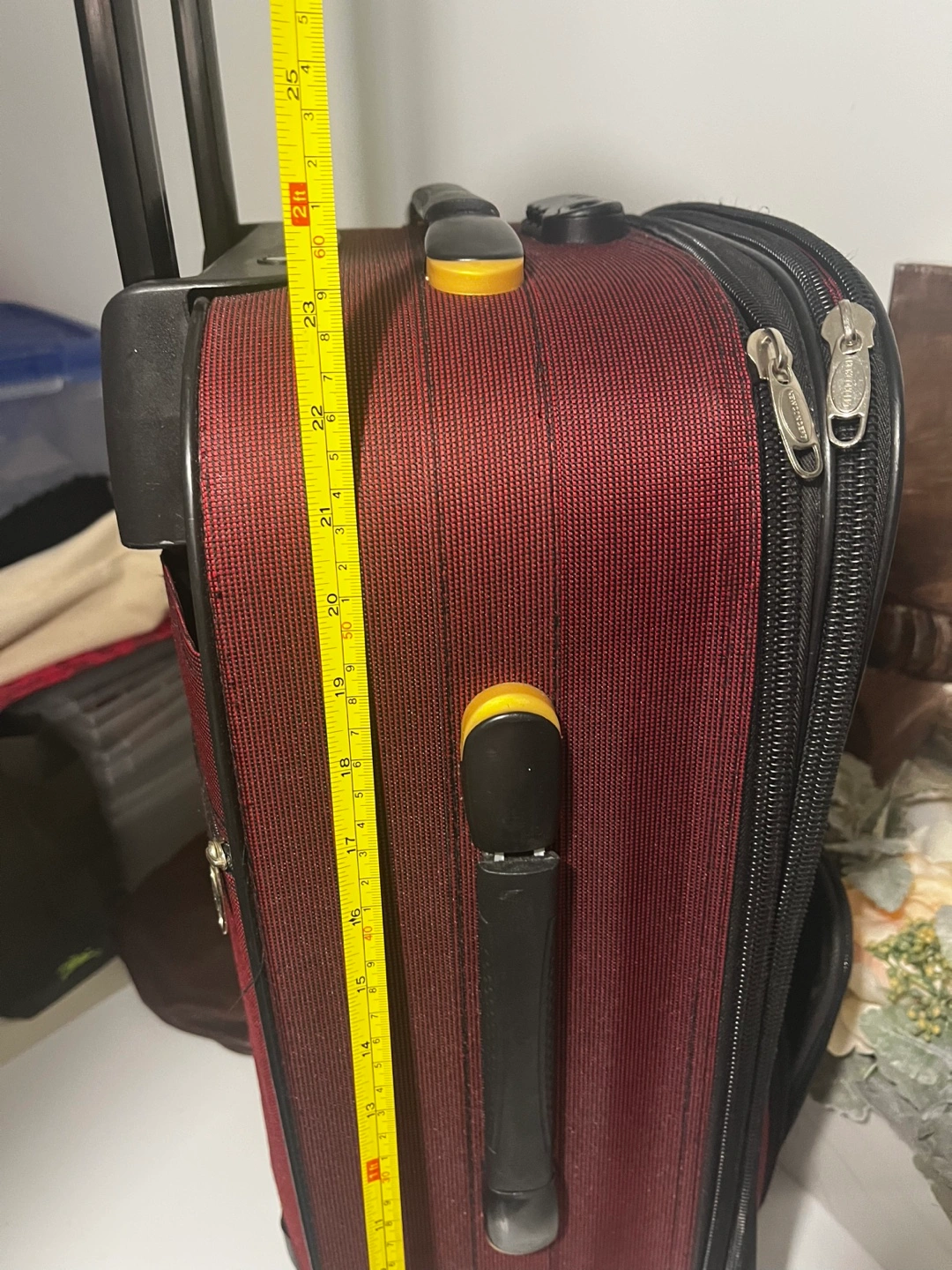 Selling a red rolling suitcase. It measures approximately 21 inches in height. It's in good condition and ready for your next trip!