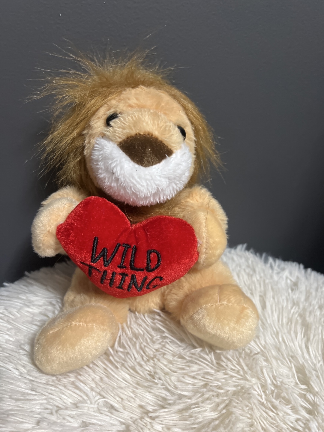 A cute lion plush toy holding a red heart that says 'Wild Thing' would make a great gift for a child or a fun addition to any collection