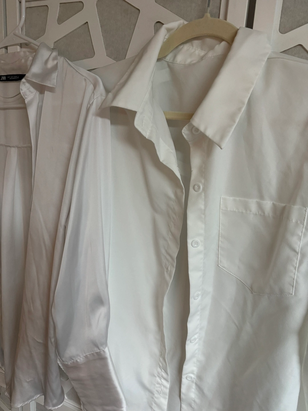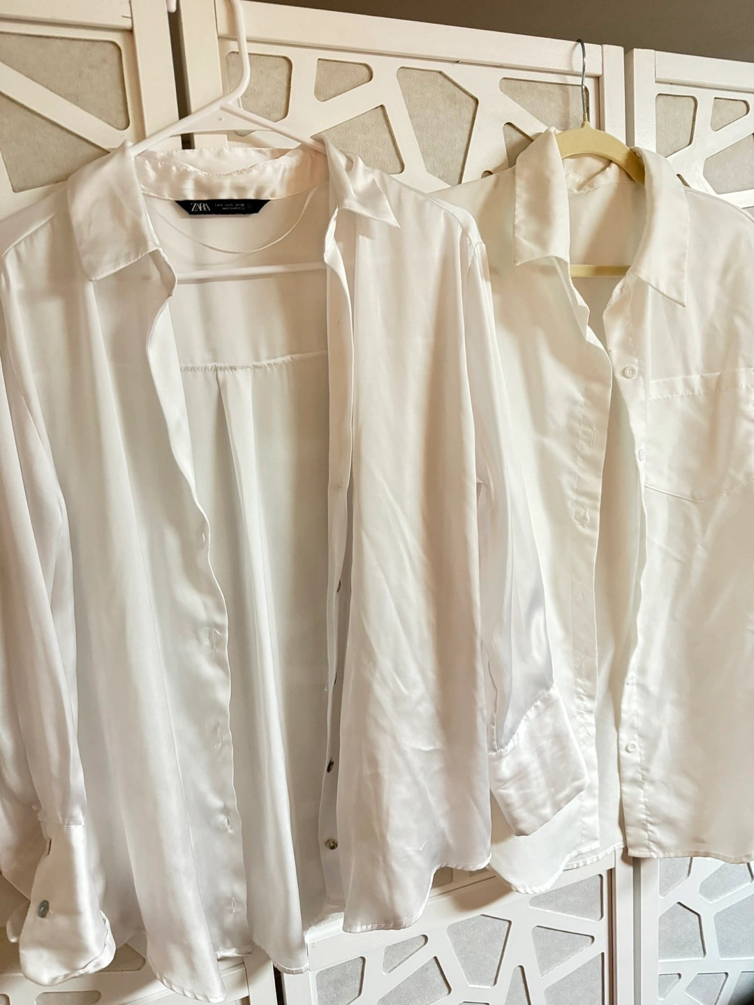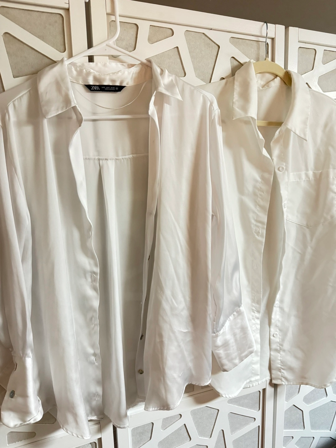 Selling a set of two white button-down shirts from Zara! They're both in great condition and perfect for any occasion. Size is not indicated, please see photos for measurements.