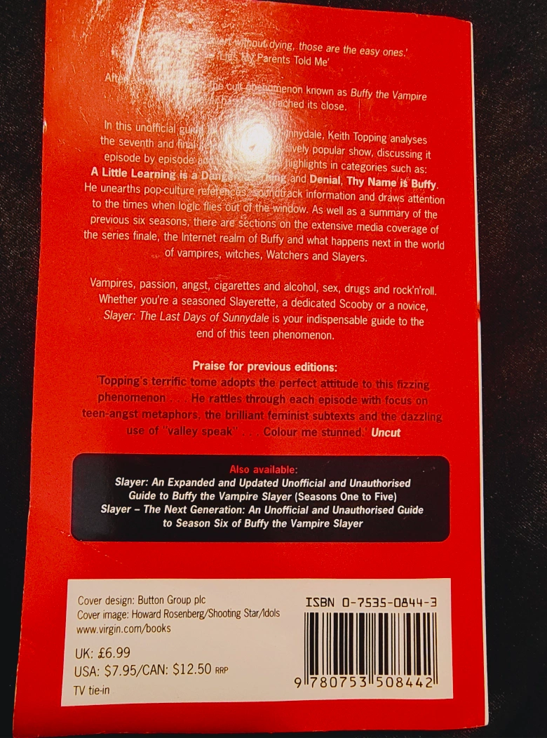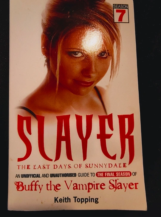 "Slayer: The Last Days of Sunnydale," an unofficial guide to the final season of Buffy the Vampire Slayer by Keith Topping. This book offers pop-culture references and soundtrack information, along with coverage of the series finale and online realms of Buffy, Watchers, and Slayers