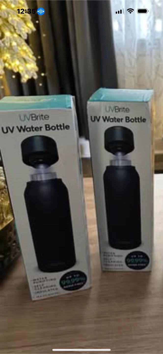 I'm selling a brand new UV Brite UV Water Bottle, still in its original box! It's designed to reduce viruses and bacteria, offering 50 disinfections per charge. It features a blitz mode and is IPX7 waterproof. It also comes with a 3-year limited warranty