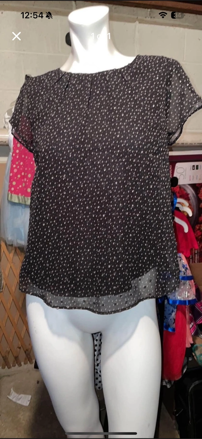 Cute black blouse with white polka dots! It has short, sheer sleeves and a sheer bottom hem. Perfect for a casual or dressy look