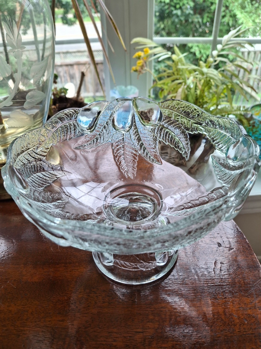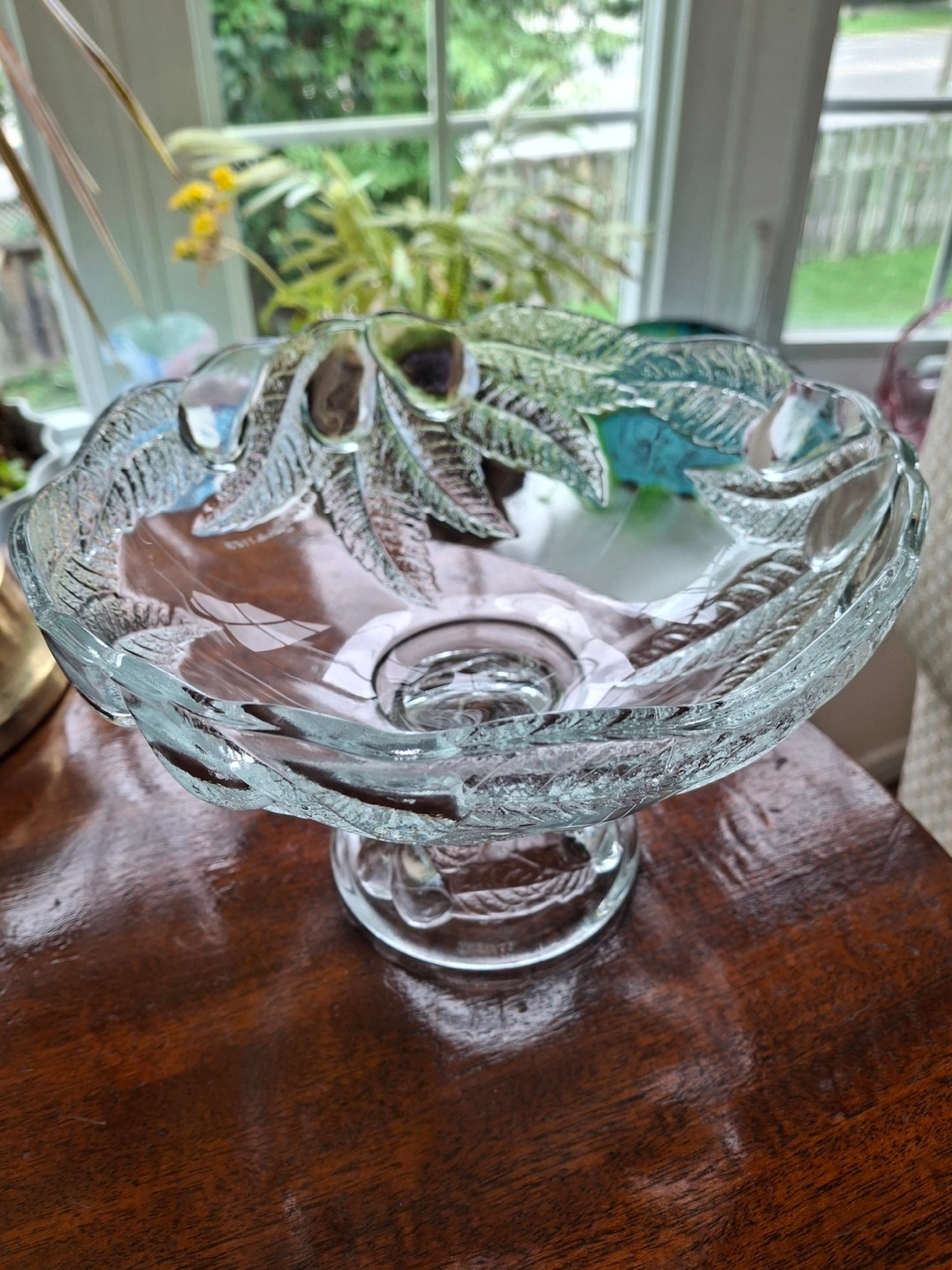 Small clear glass pedestal compote bowl. Features embossed pear leaves. Made in France. 7.75” wide, 5.75” tall. Excellent condition.