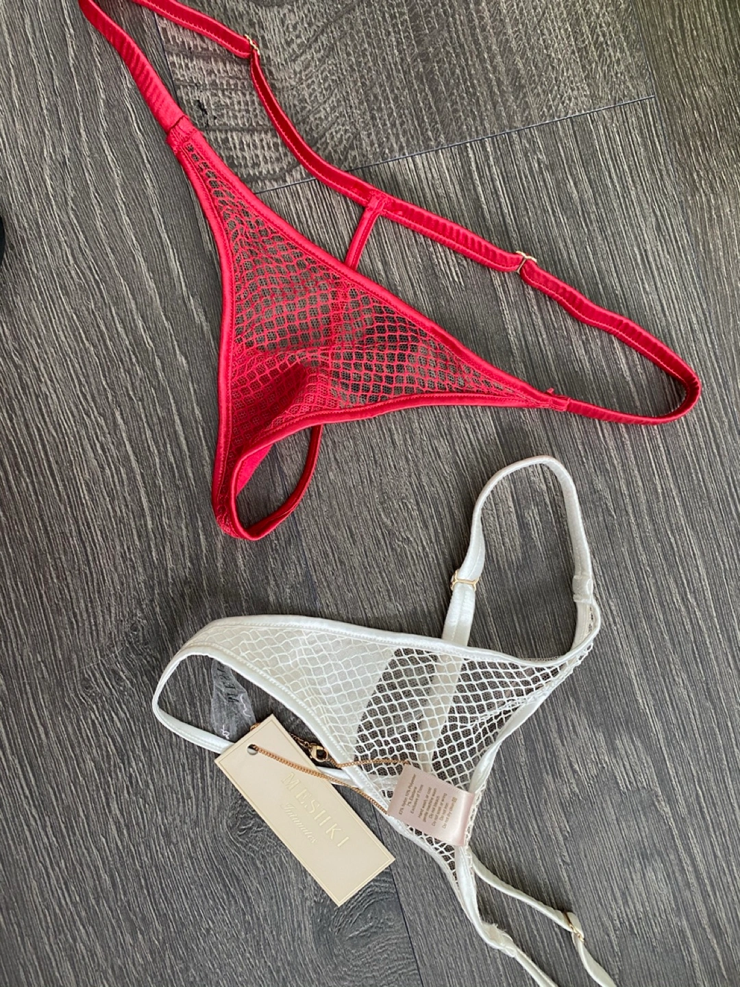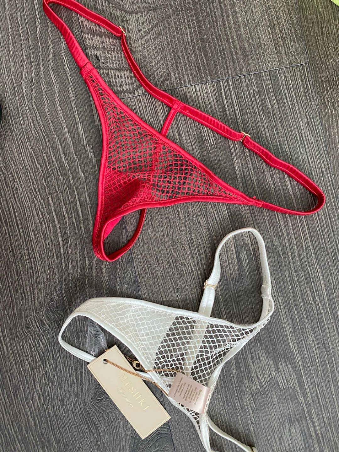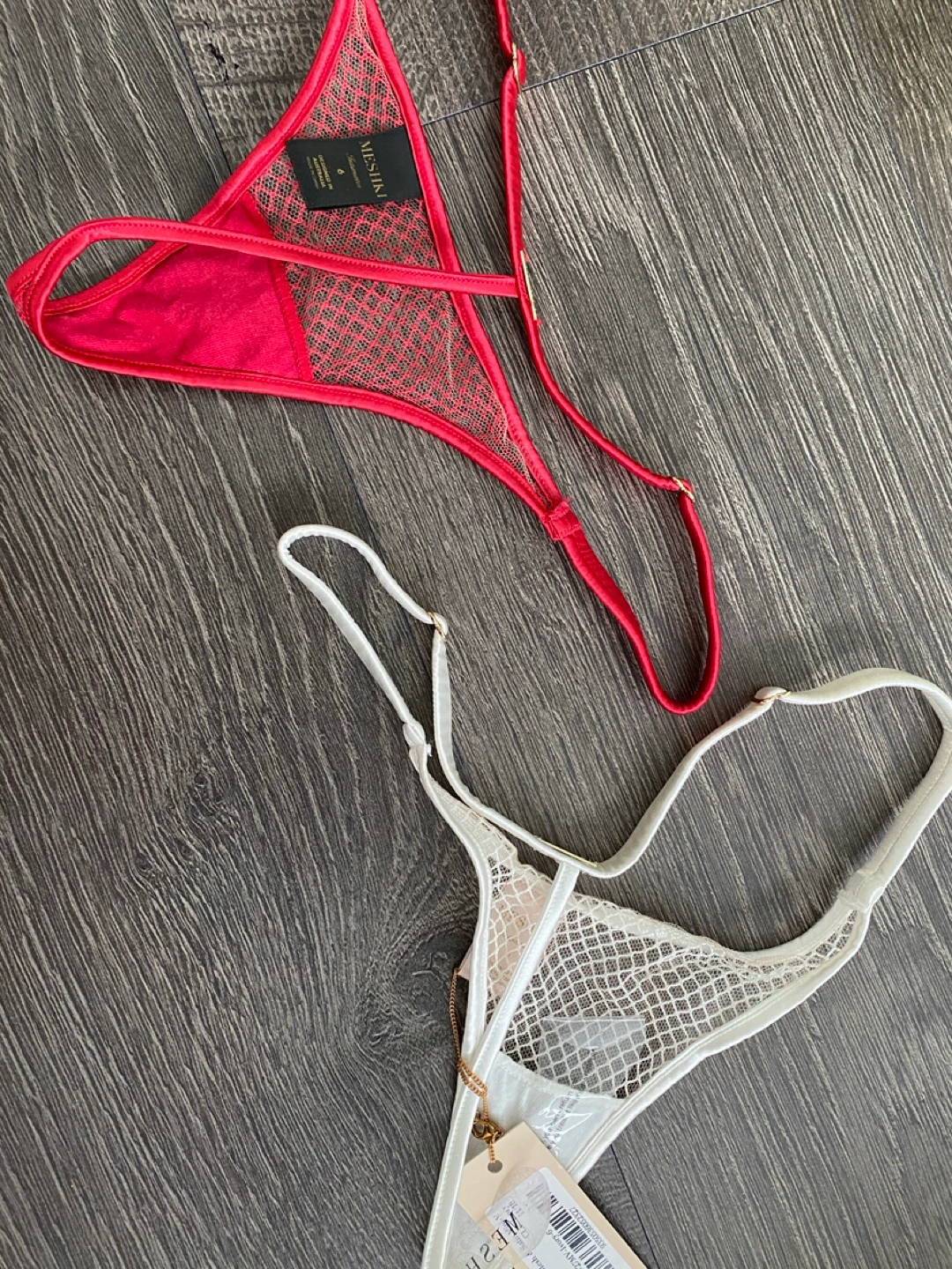 Selling a cute Meshki lingerie set! Includes one red and one white thong, both size xsmall. They're in great condition and ready for a new home, they’ve never been worn, just looked too small. Got some weirdos asking if they’re used, they’re NOT!