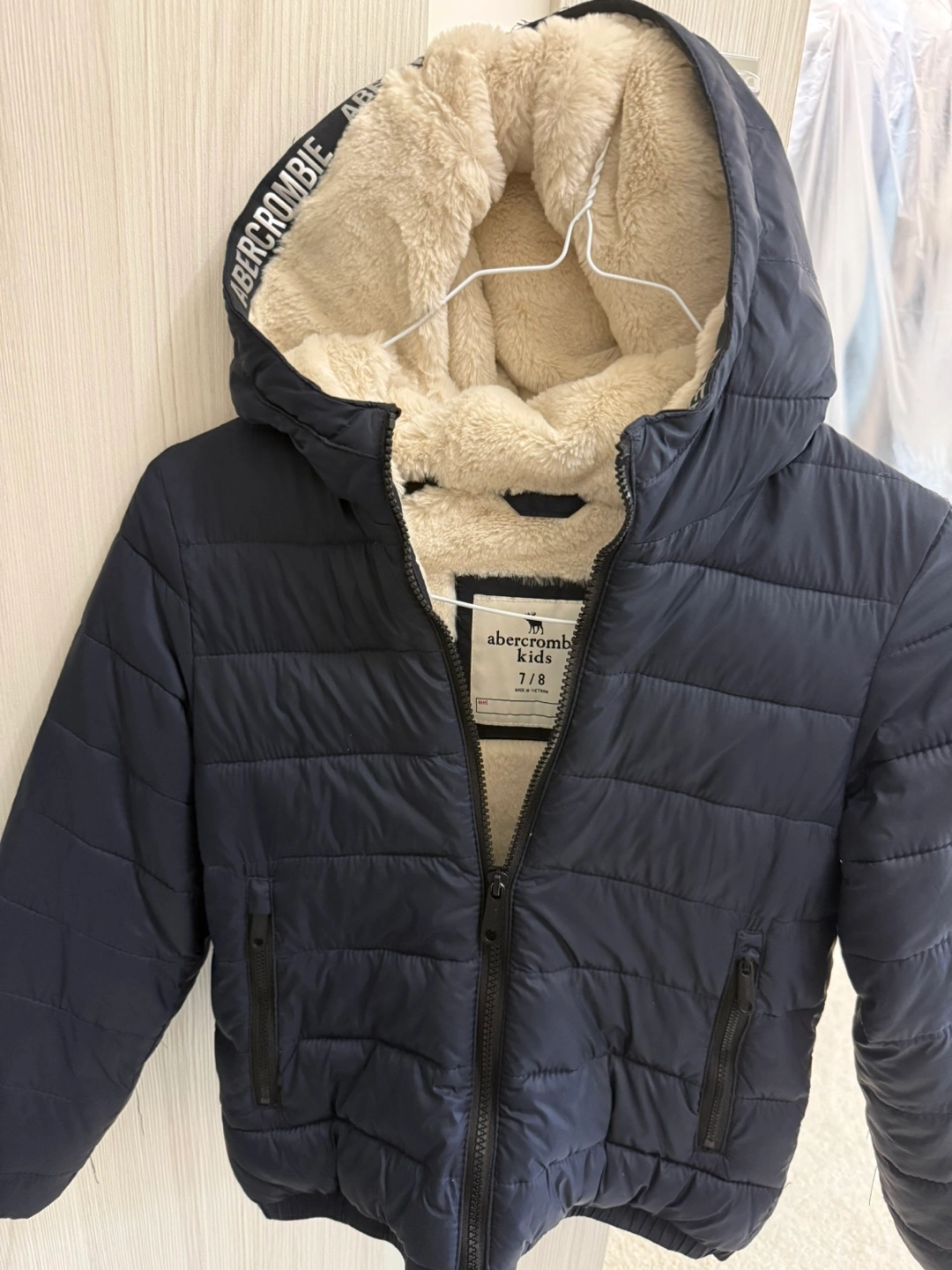 Abercrombie Kids puffer jacket in size 7/8! It's a navy blue color with a cozy, furry lining inside the hood and body. Perfect for keeping your little one warm and stylish.