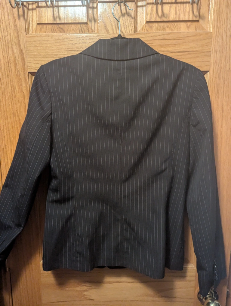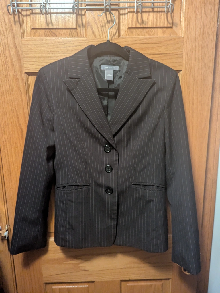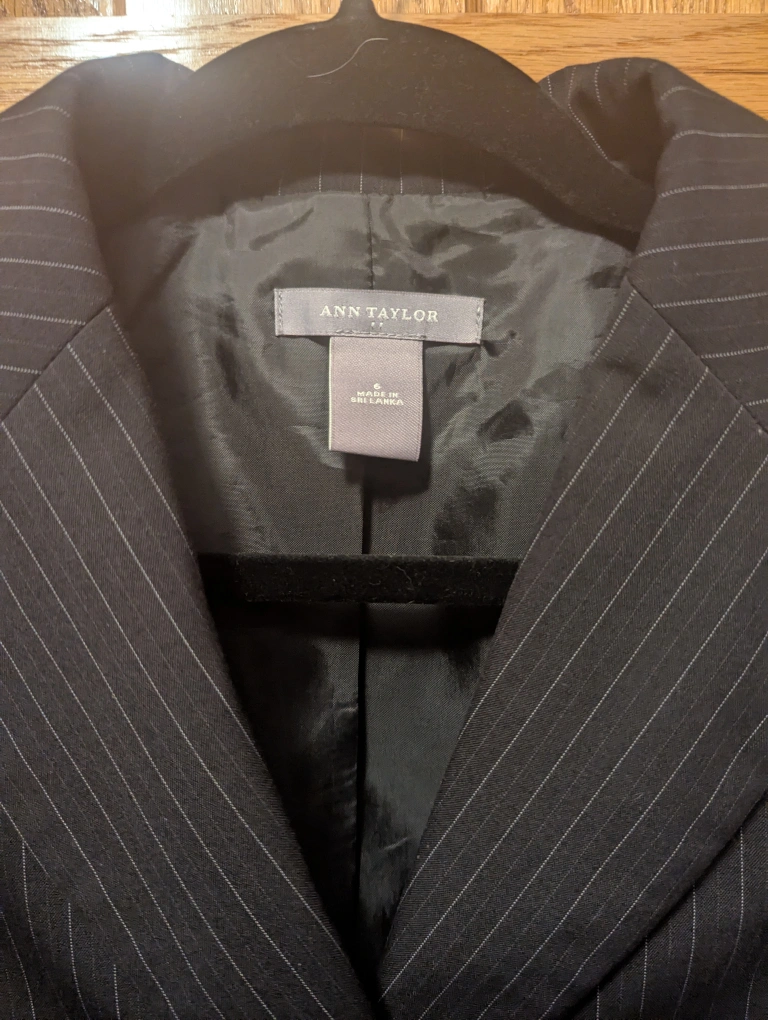 Selling an Ann Taylor pinstripe blazer in size 6. It's a classic piece that's perfect for work or a more dressed-up look. The blazer is in good condition and ready for a new home! Pickup in Uptown, send over best offer. If you bundle with any other listings, I can give you a discount!