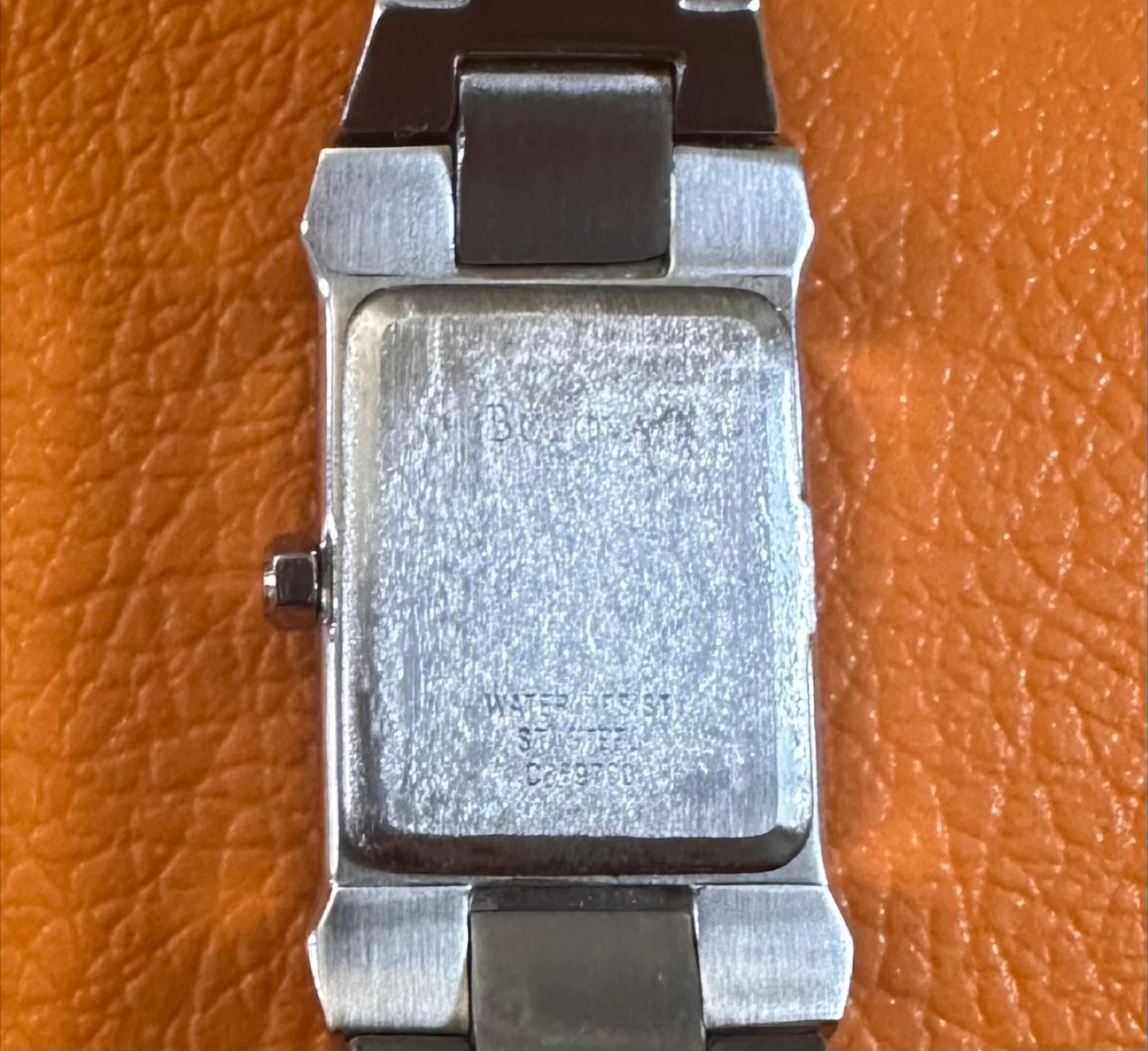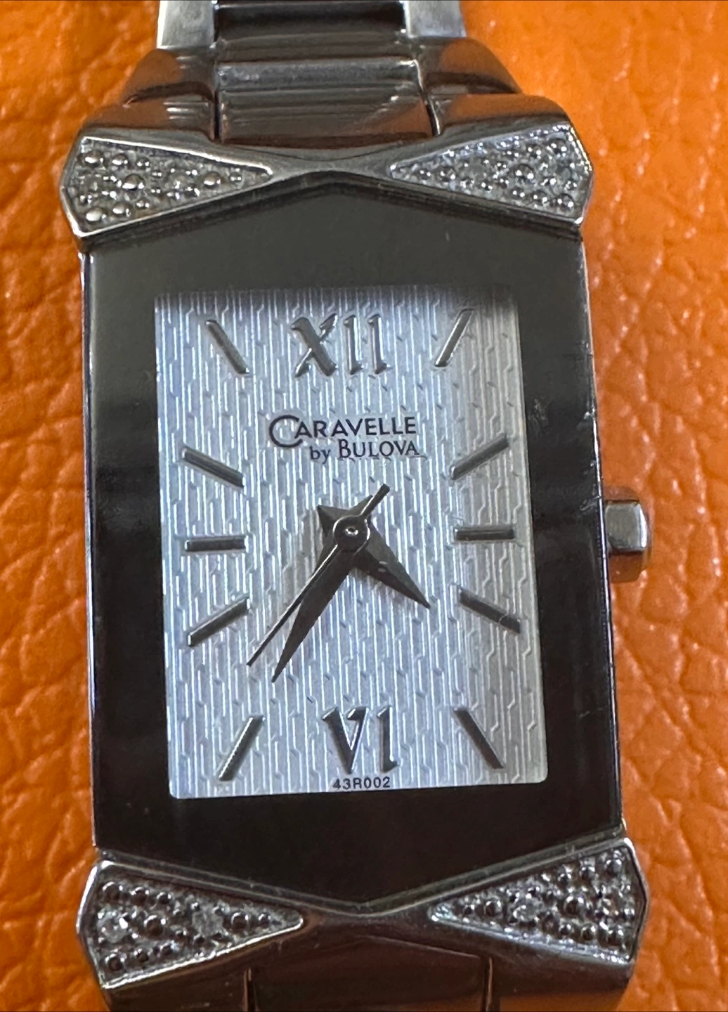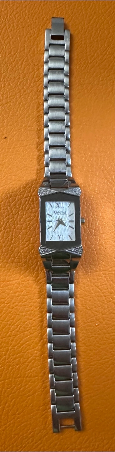 Selling a working Caravelle by Bulova ladies' watch. It features a rectangular face with a silver-toned dial and a stainless steel band. The model number is 43R002 with serial nos. C869780. The back of the watch indicates it is water resistant. With new battery.