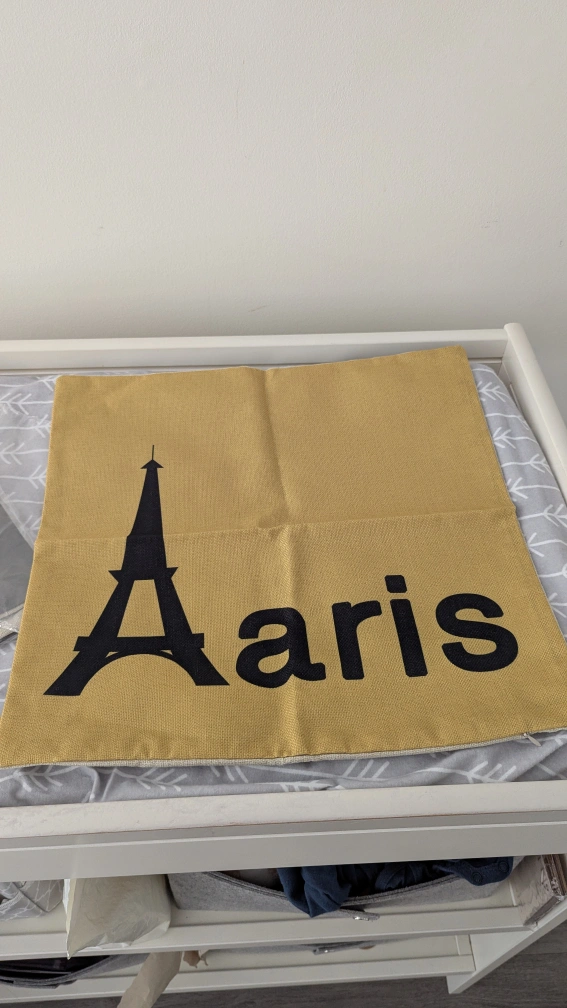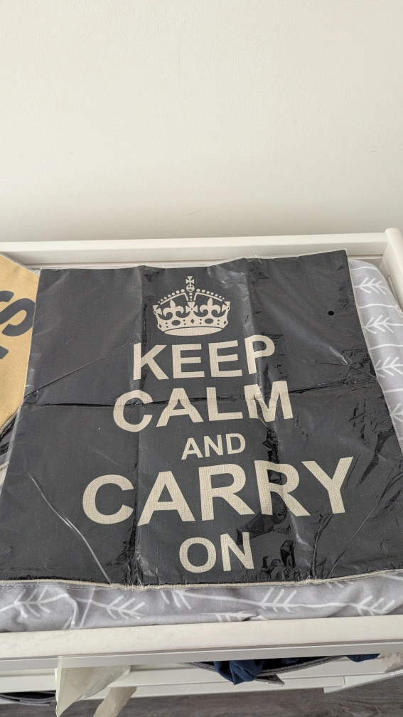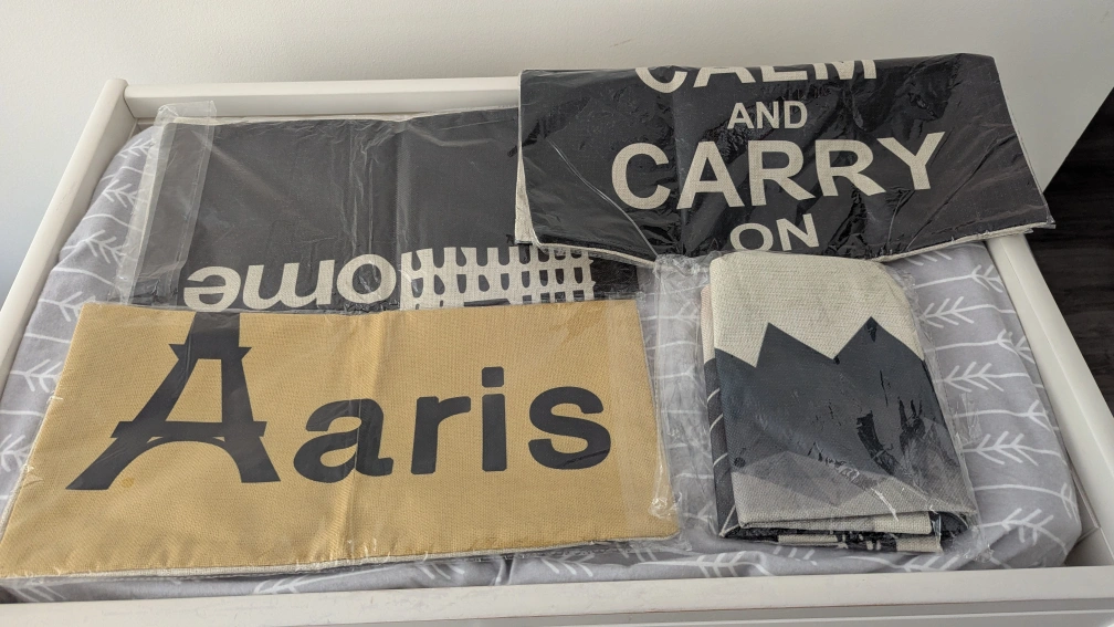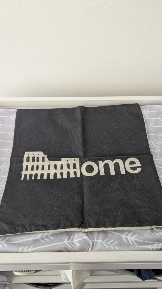 Selling a set of five decorative throw pillow covers. They feature various designs including 'Keep Calm and Carry On,' a geometric heart, a city skyline, 'Paris,' and 'Rome'. They are in Brand new condition and ready to add a touch of style to your home!
