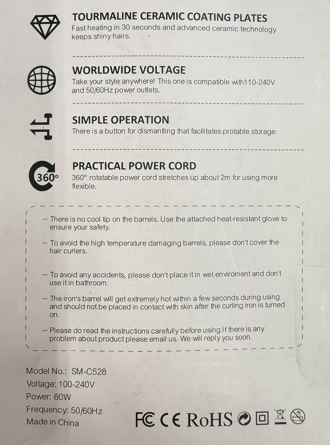 Brand new with 5 interchangeable ceramic barrels (see the pictures for more details), 1 heat glove and 2 hair clips. Fast 30s heat-up. Perfect for hair styling!