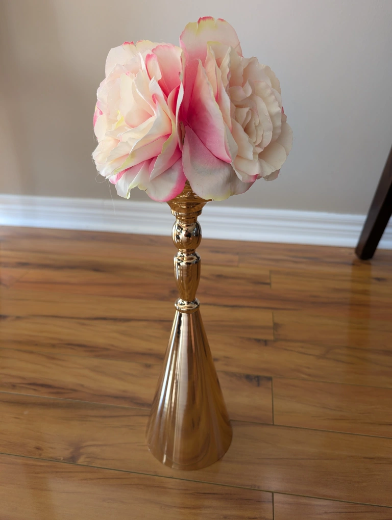 Selling a beautiful gold floral centerpiece! It's in great condition and would look lovely at any event or in your home. The flowers are a delicate pink and white colour.