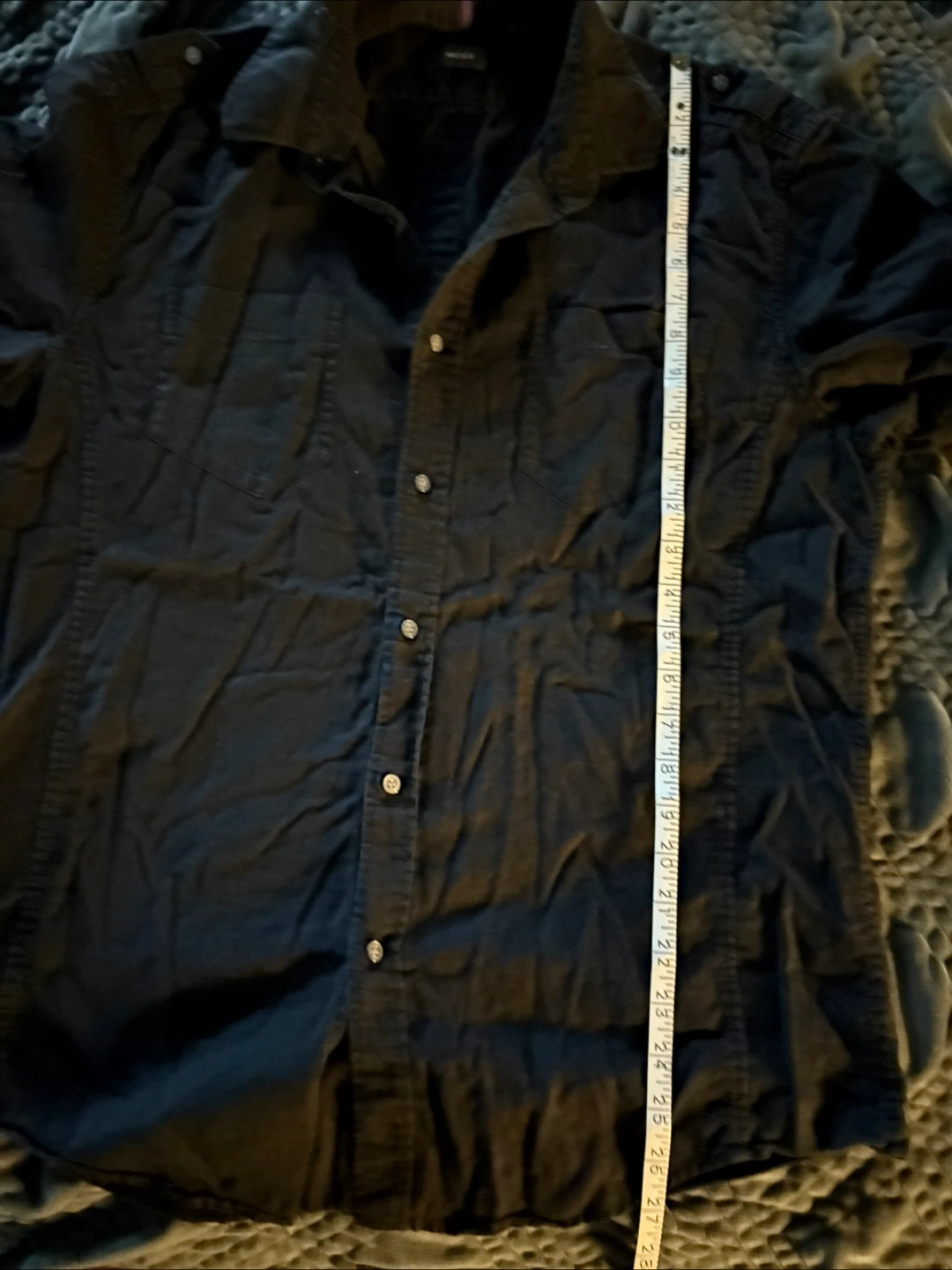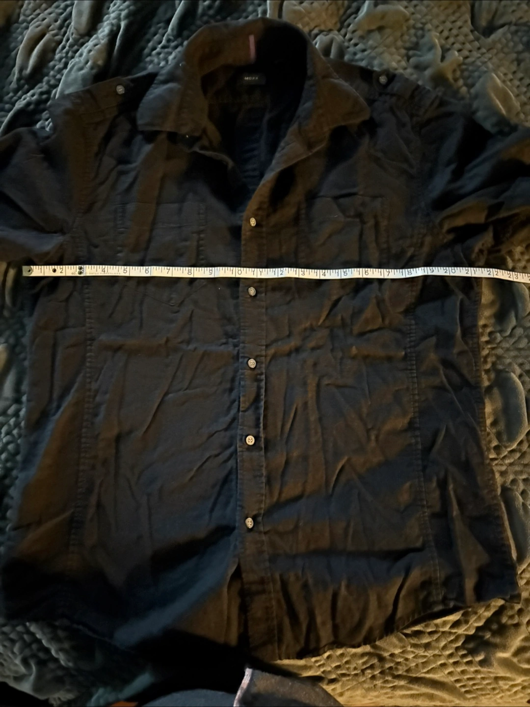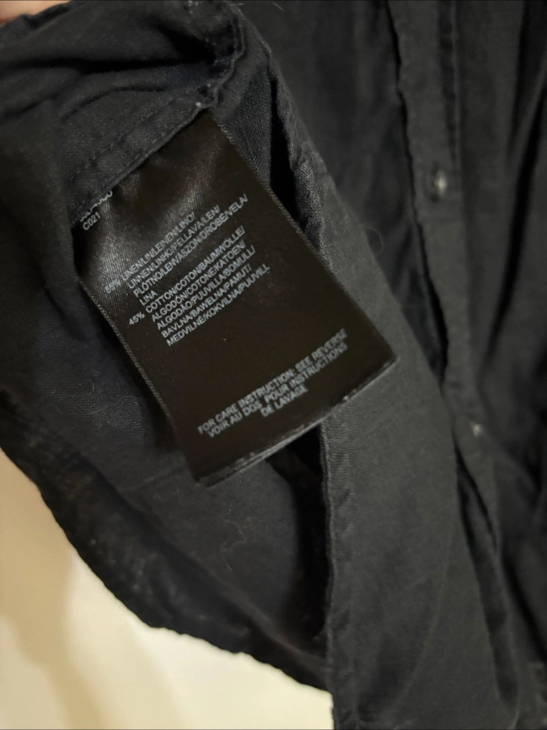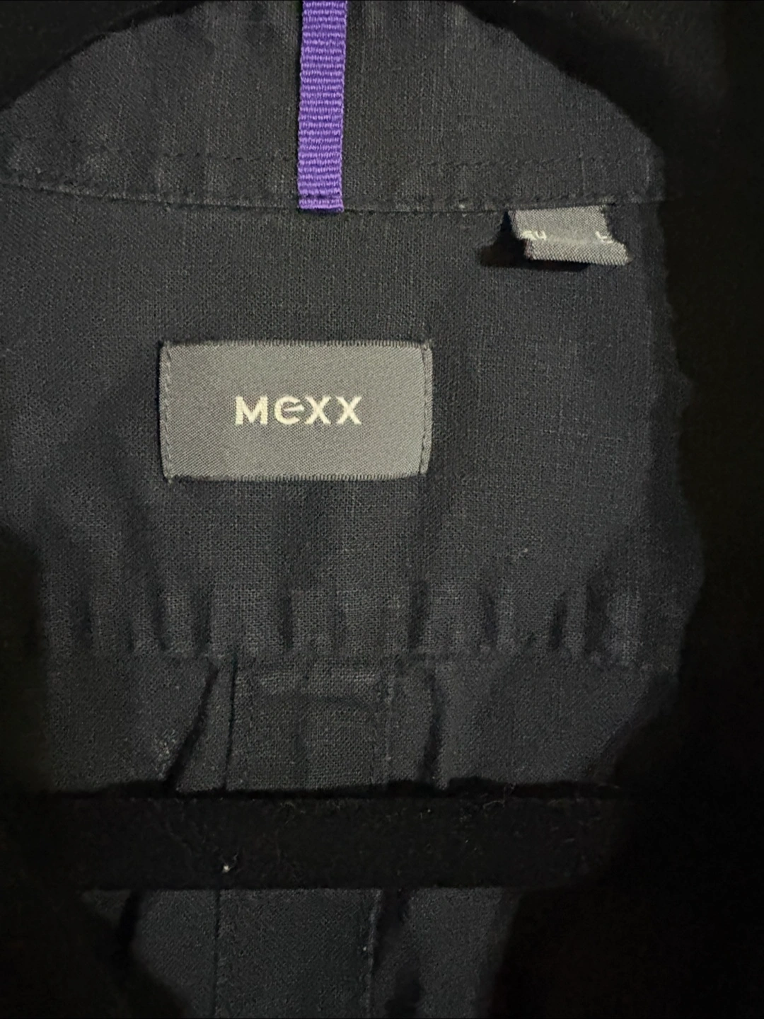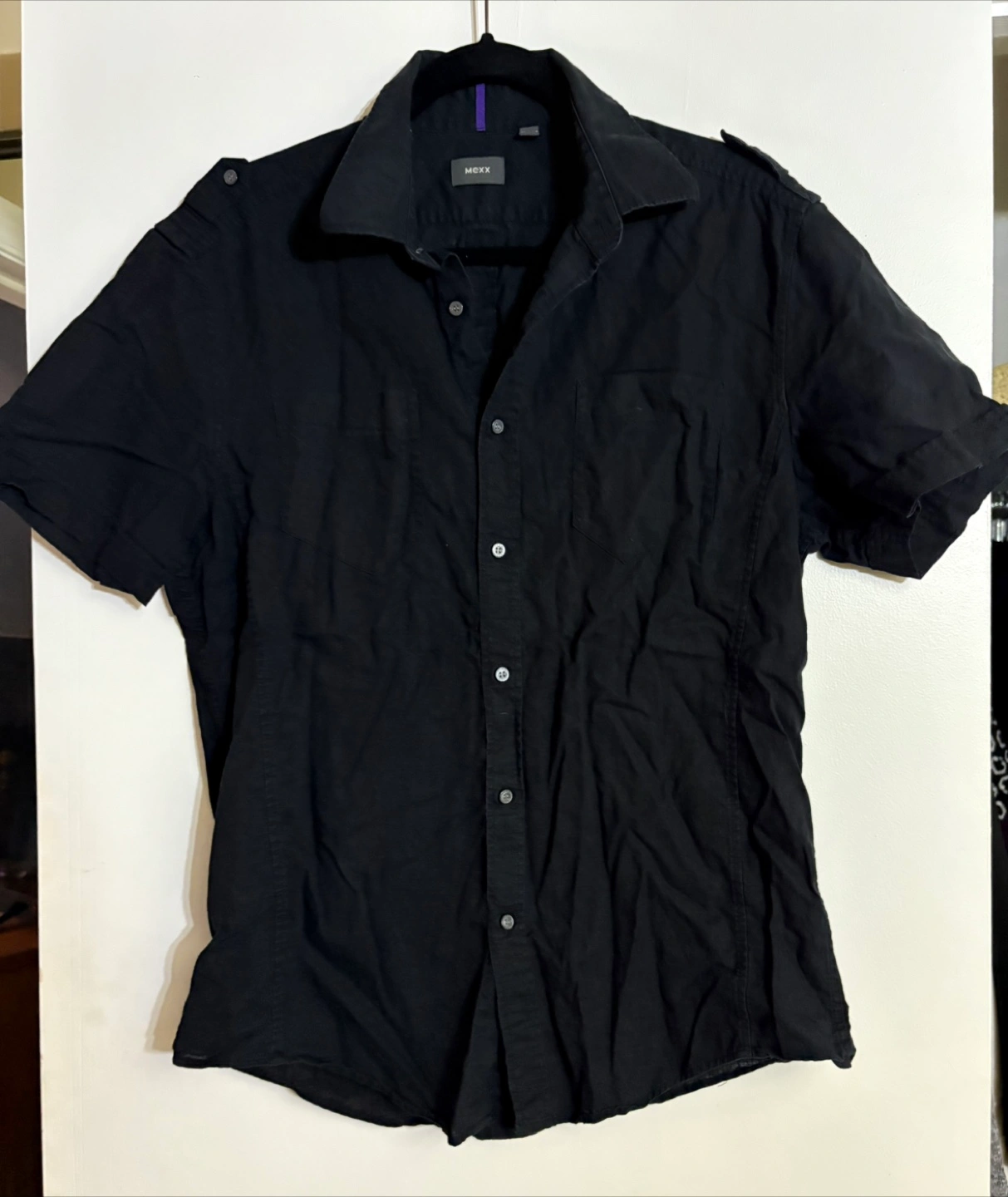 Here's a Mexx short-sleeve button-up shirt in classic black! The material is a blend of 55% linen and 45% cotton, making it super comfy and breathable. It's in great condition and ready for a new home