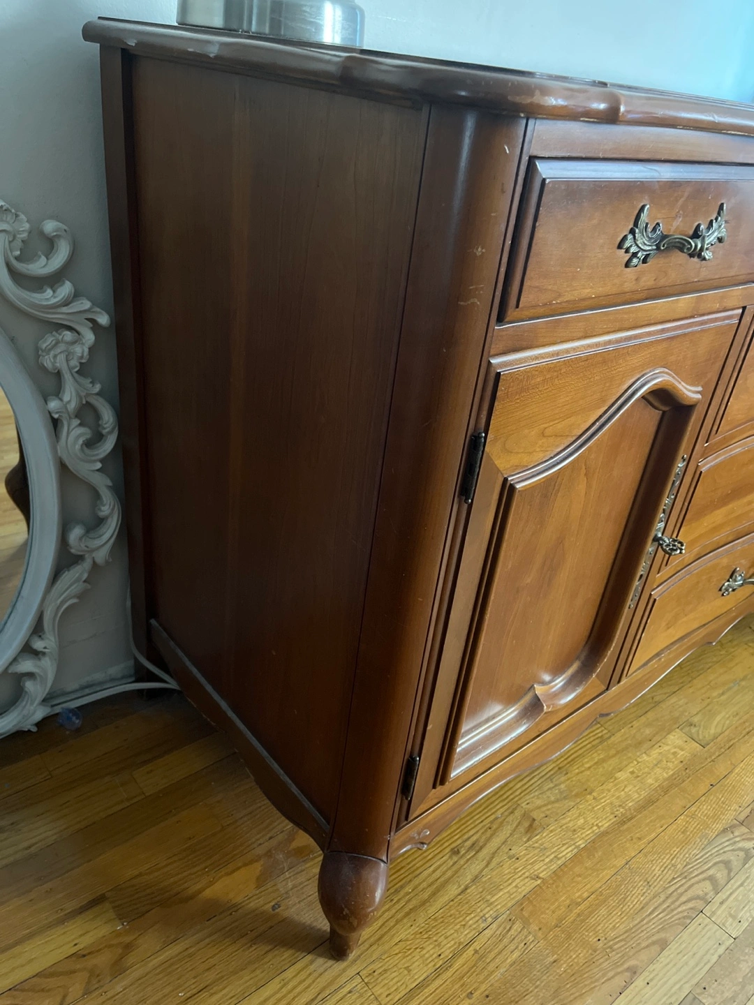 This dresser has great bones and I’m loathe to send it to the dump. It does have a lot of scratches, watermarks etc. and right cupboard door is chipped.