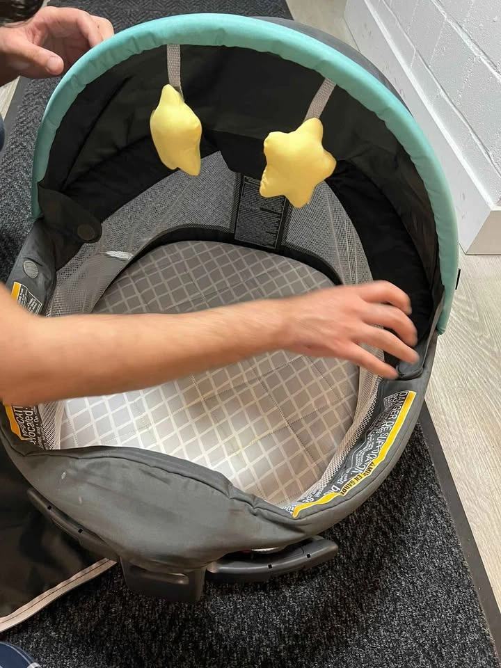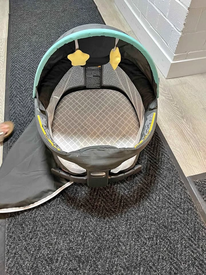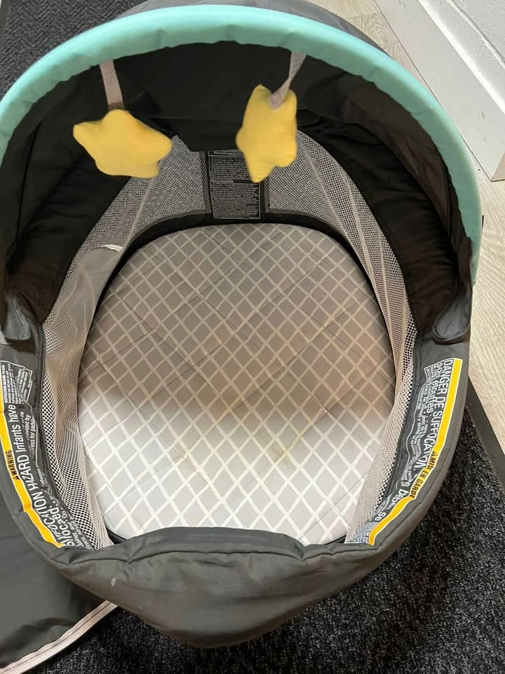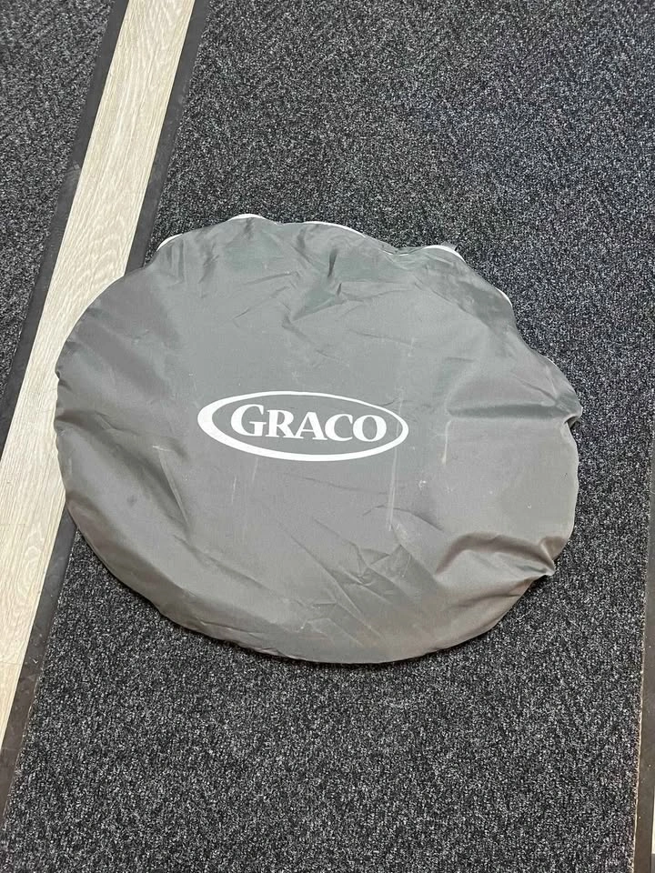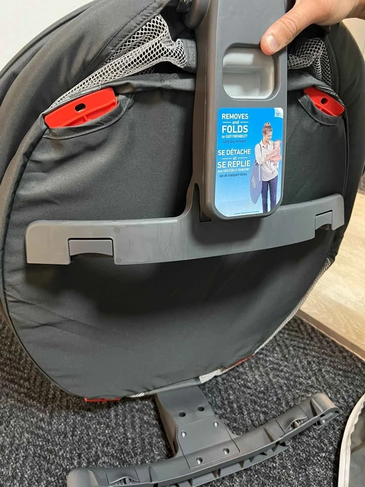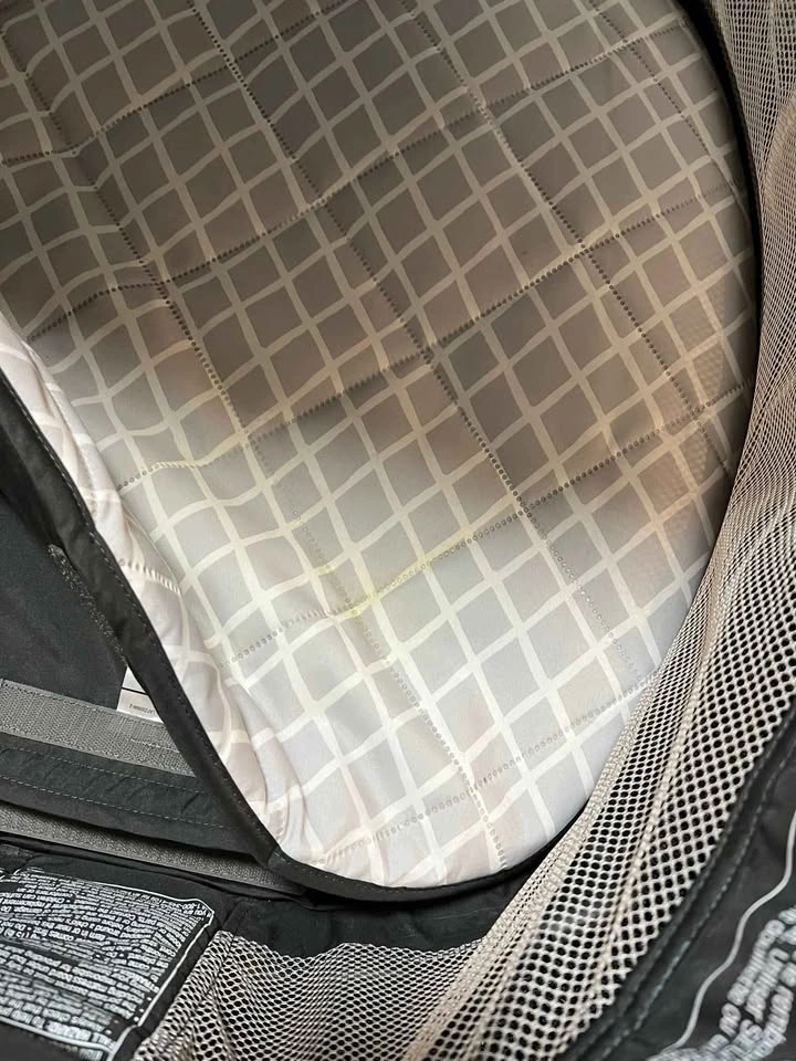 Does have a stain on the cover that is removable and can be washed. See photo. Smoke and pet free. Does have a bag to carry it easily. Check all the photos!