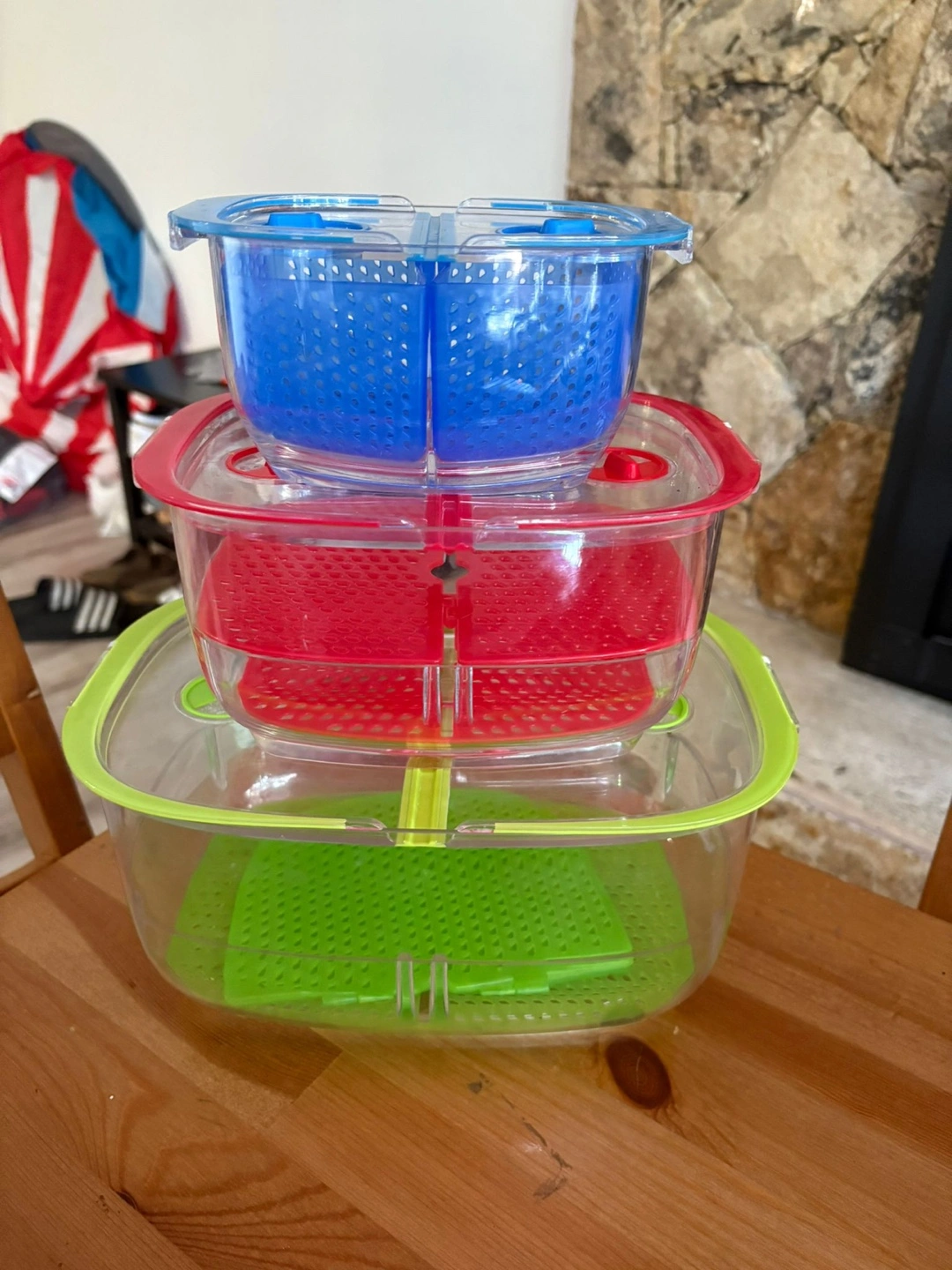 Here are some stackable food storage containers! They come in a variety of colours, including blue, red, and green. Perfect for keeping your veggies fresh in the fridge!