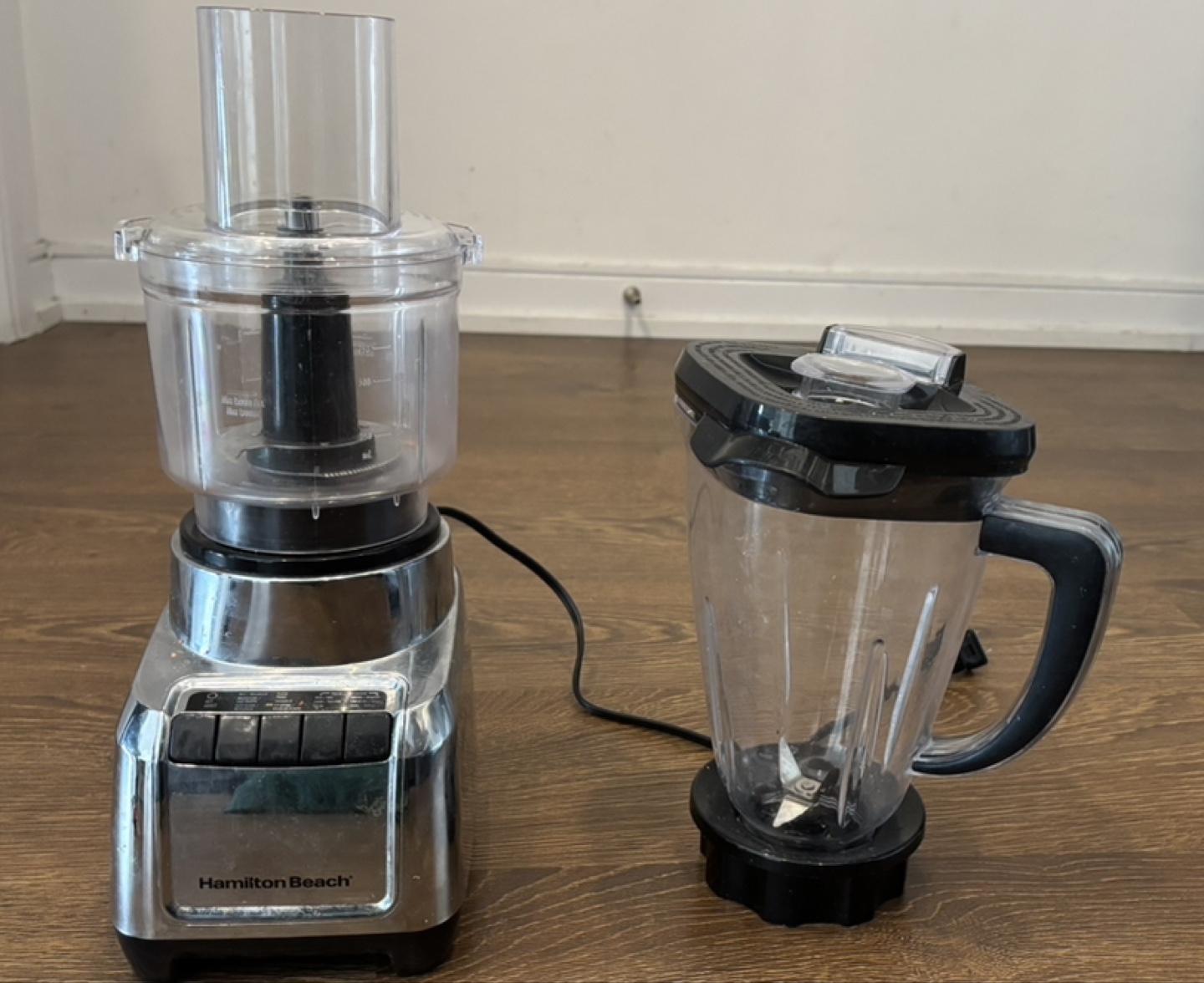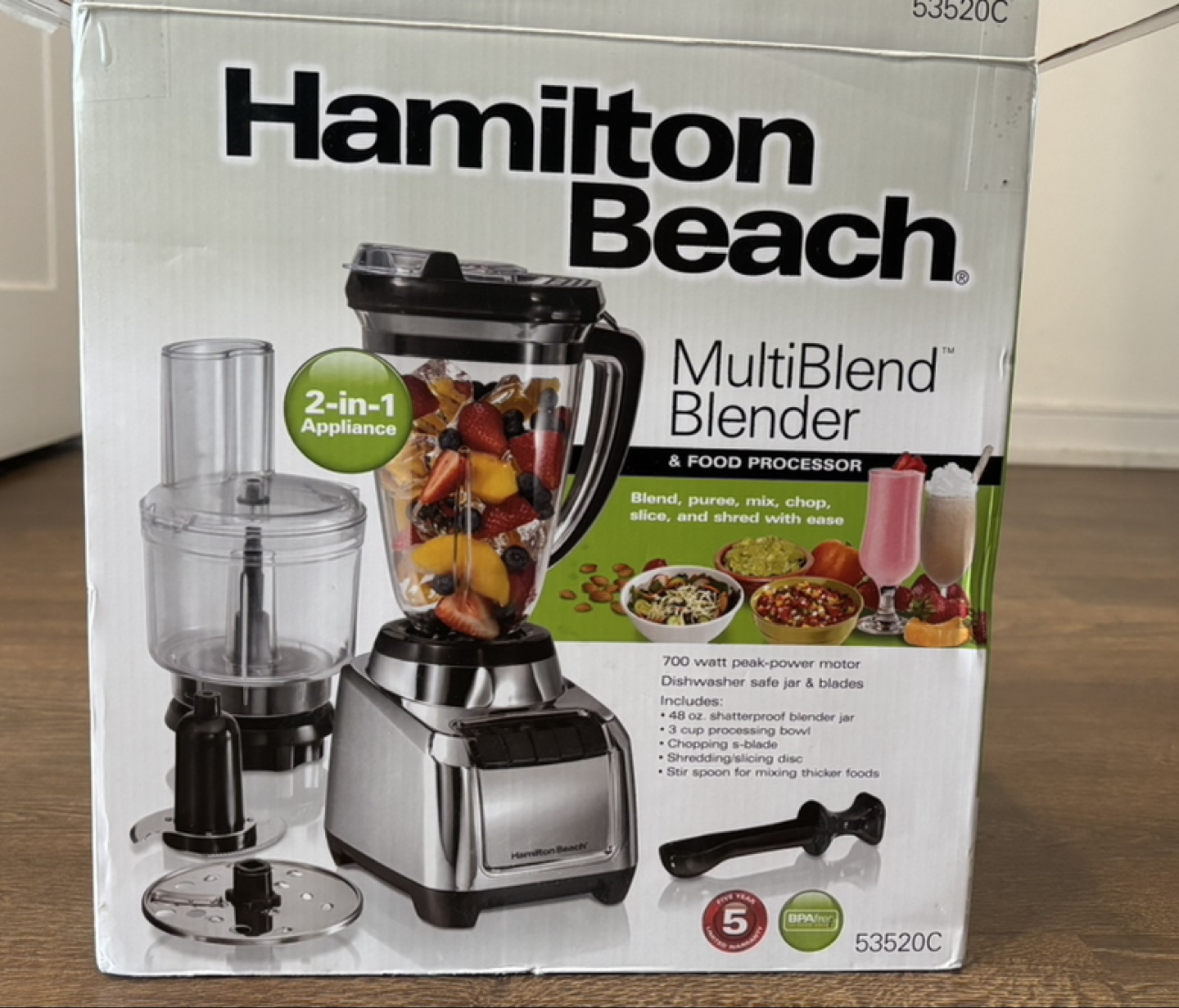 I'm selling a Hamilton Beach MultiBlend Blender and Food Processor. It's a 2-in-1 appliance that can blend, puree, chop, slice, and shred with ease. It has a 700 watt peak-power motor and dishwasher safe jar & blades.