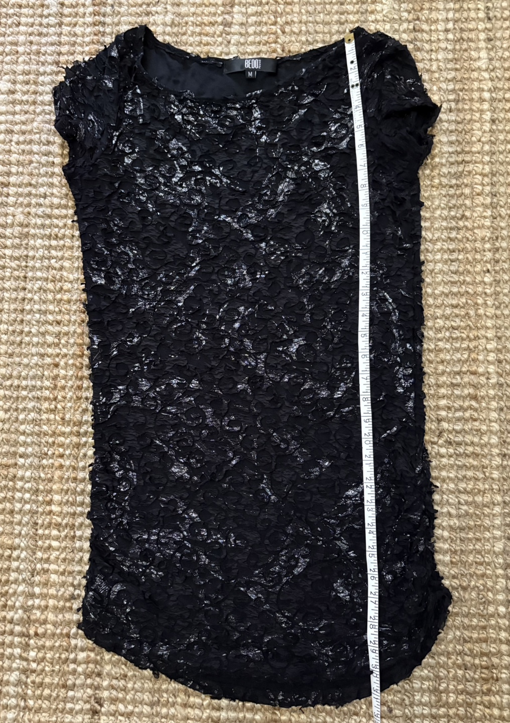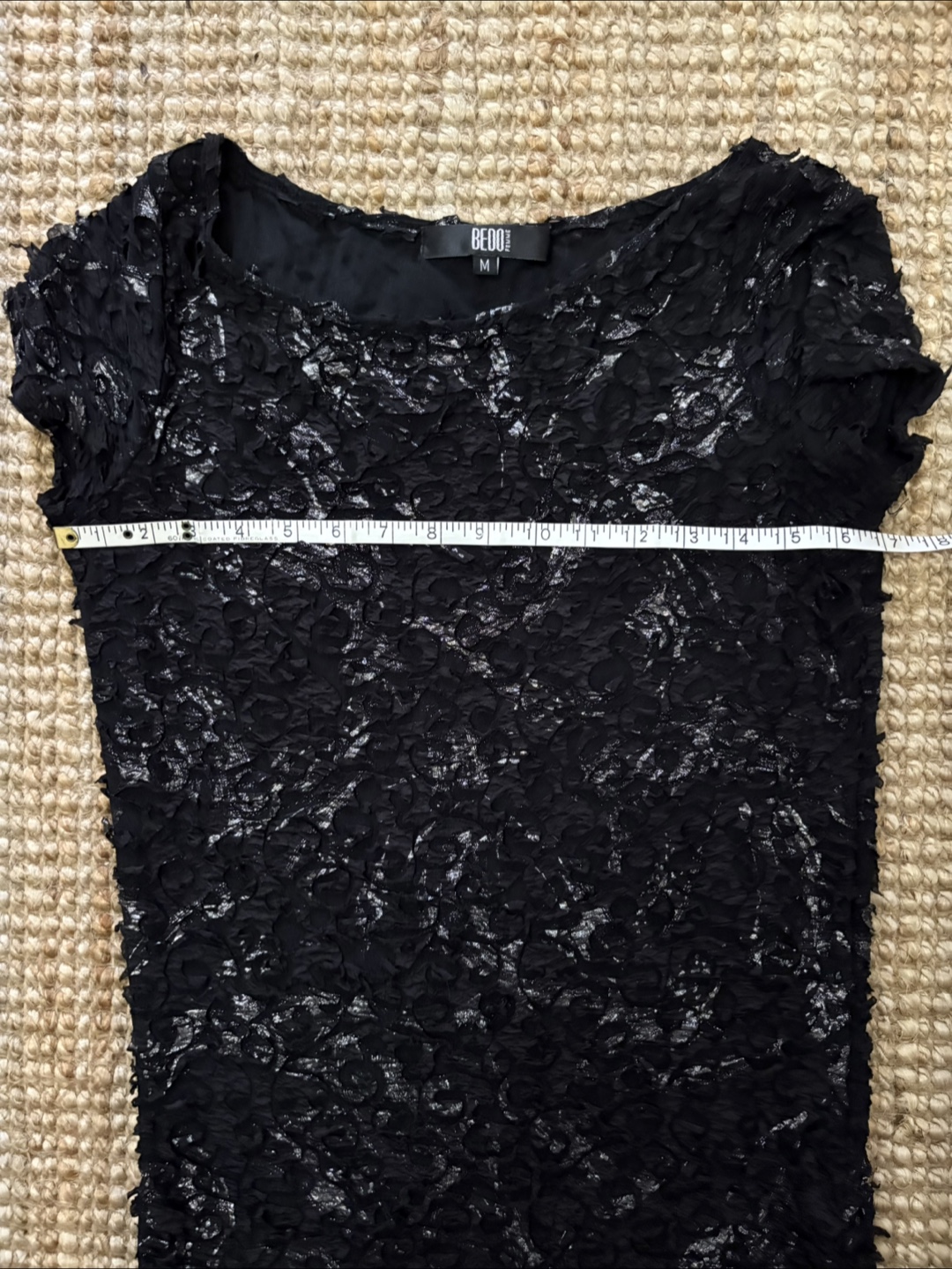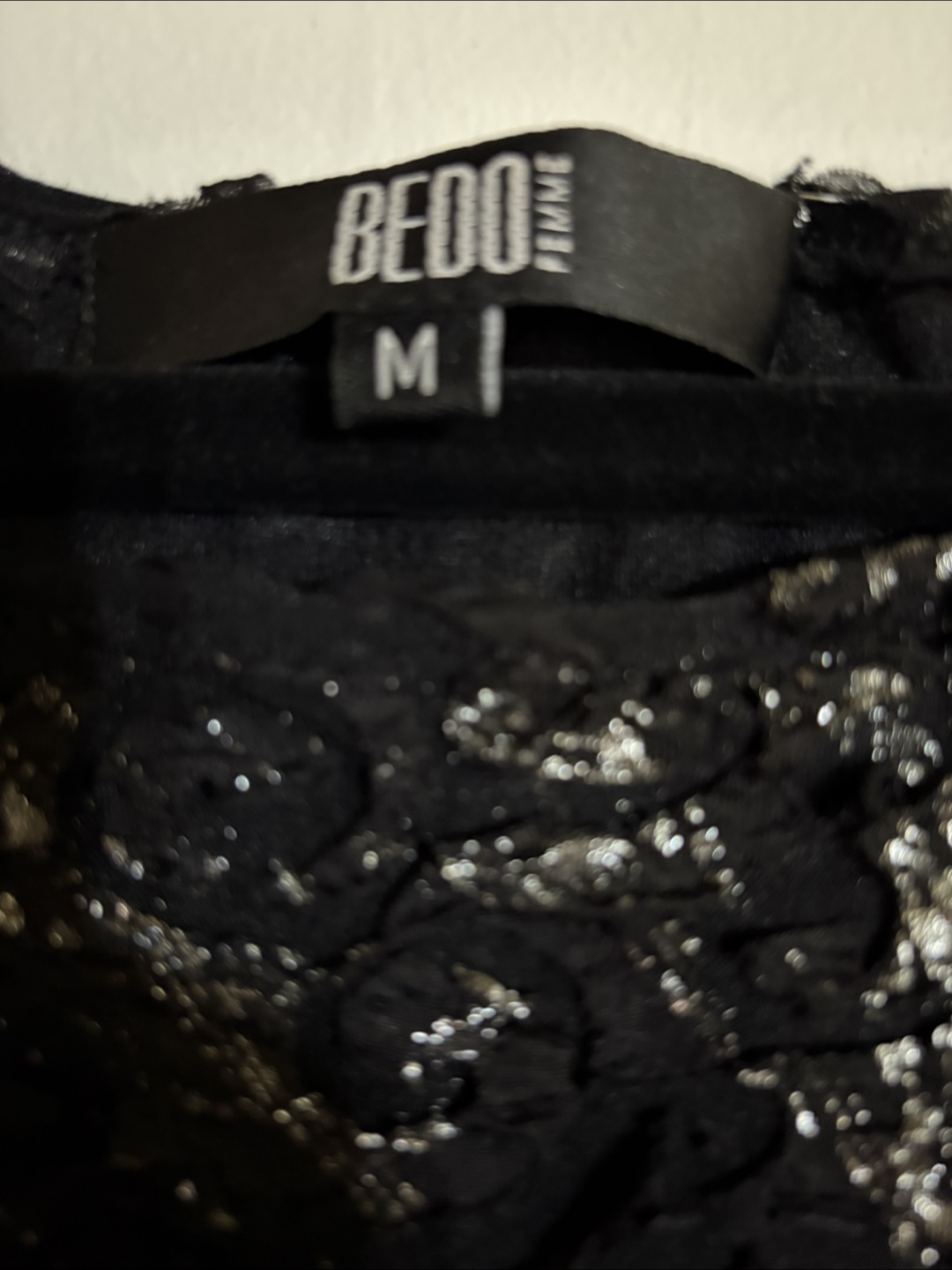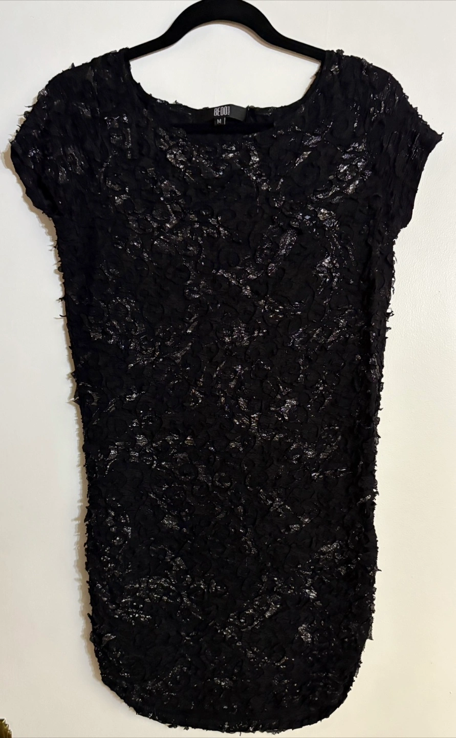 Selling a Bedo Femme black lace dress in size medium. It has a unique pattern and a flattering fit.