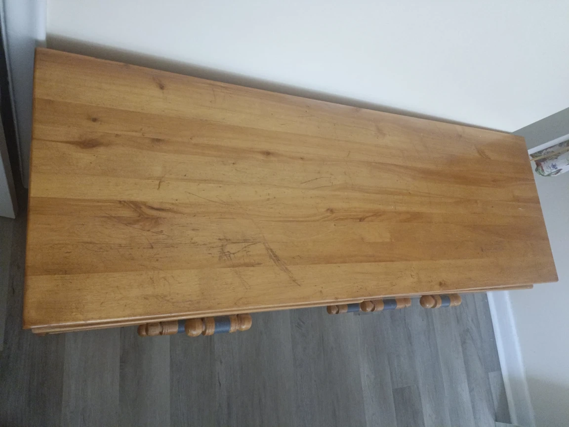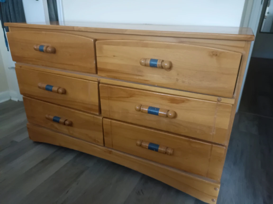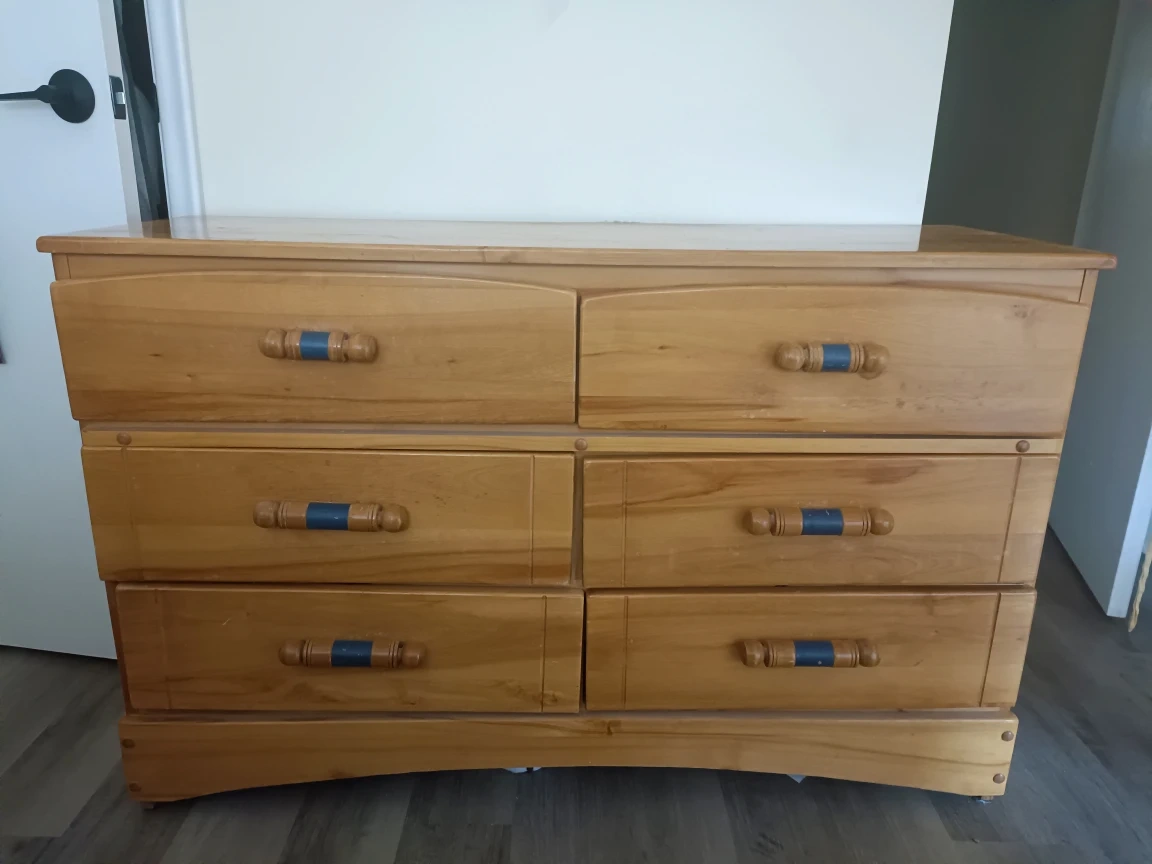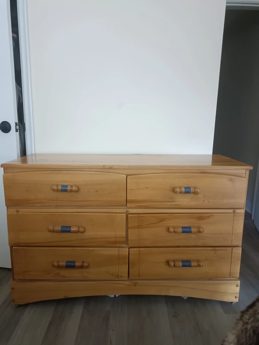 I am moving at the end of this week and unfortunately this piece can't come with me! It is a wooden dresser with 6 drawers a little heavy but easy to move. Drawers are a good size and have nice little blue handles. It is a vintage piece, unsure of the year but given to me by grandparents, so there are some scratches/ wear and tear. Asking for 40 but negotiable as need it out by the 30th. Pick up close to Keele station. Send me a message!