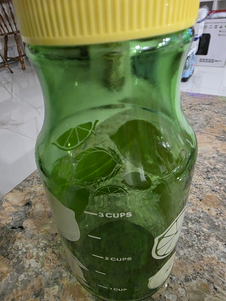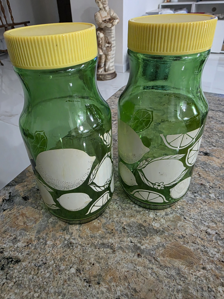 Selling a cute vintage lemonade jar! It's green glass with a yellow lid and has a fun lemon design on it. It holds up to 3 cups, perfect for a small batch of your favorite drink