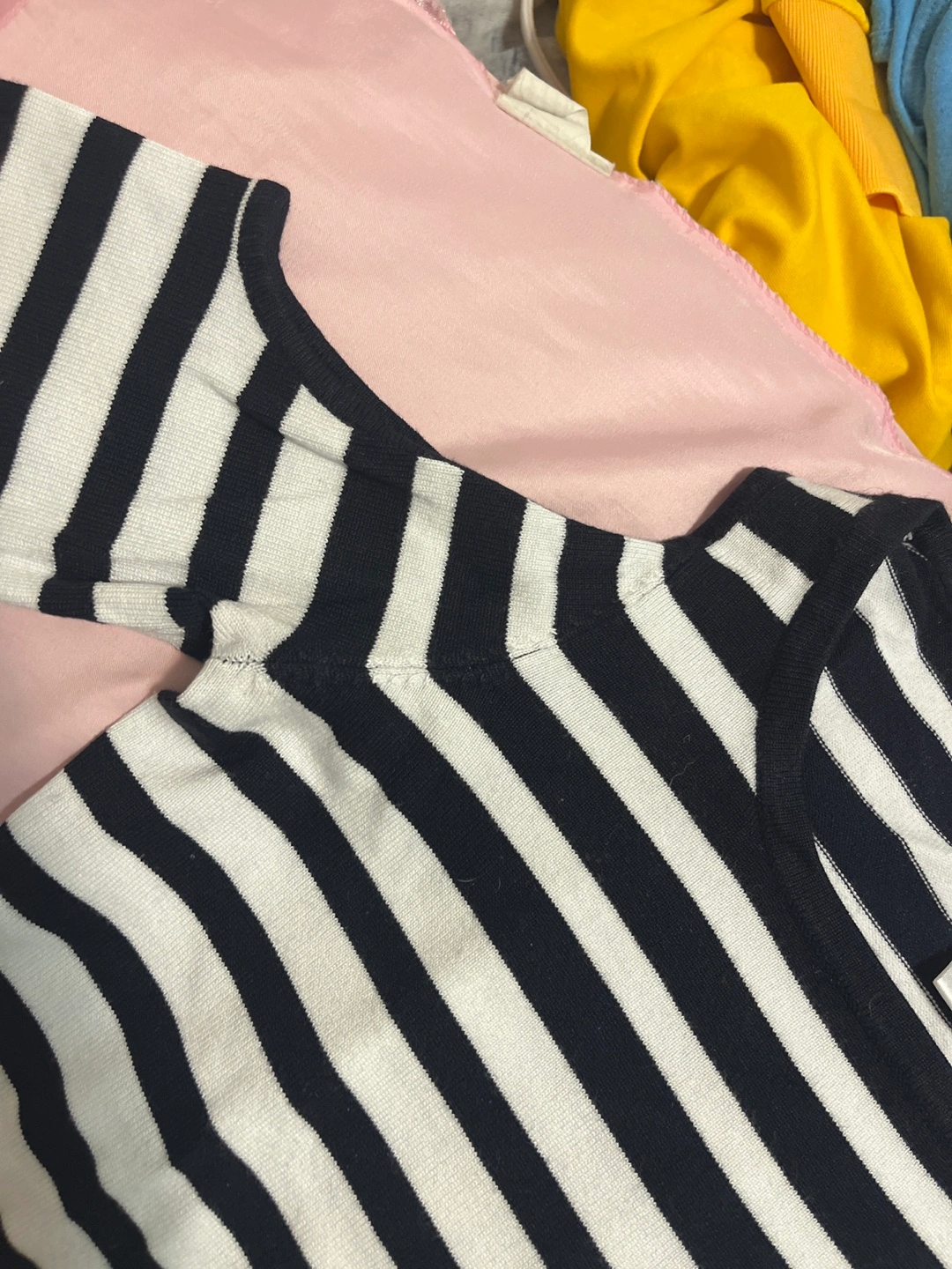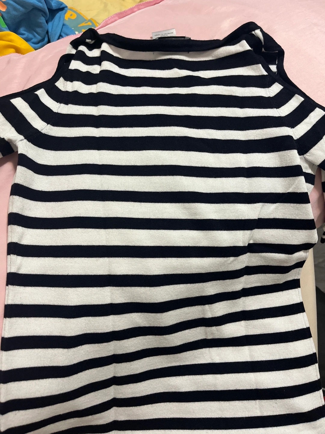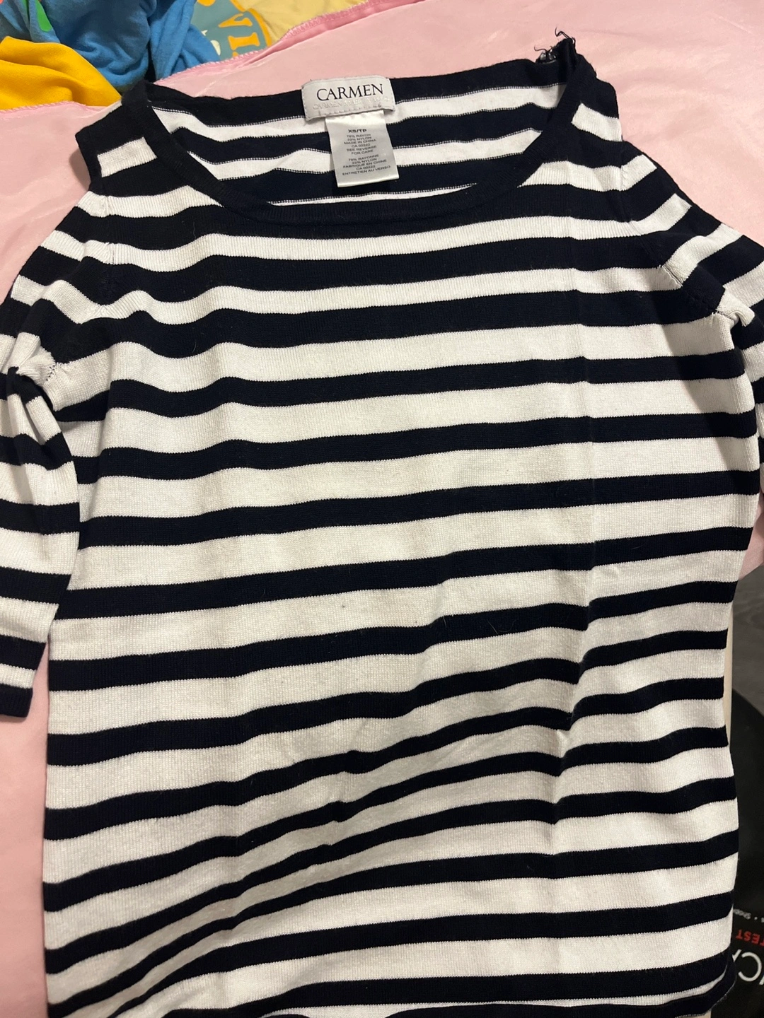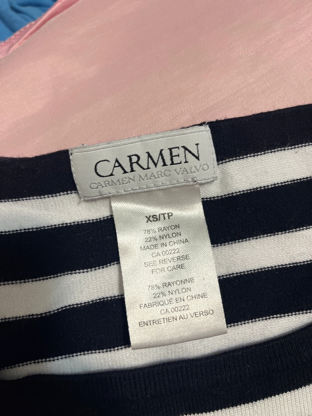 Here's a cute striped top from Carmen Marc Valvo! It's a size XS and made of 78% rayon and 22% nylon. Perfect for a casual day out!