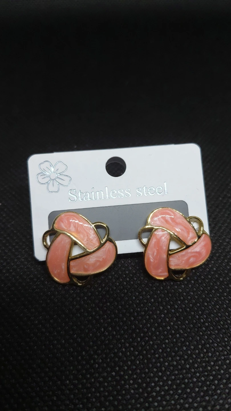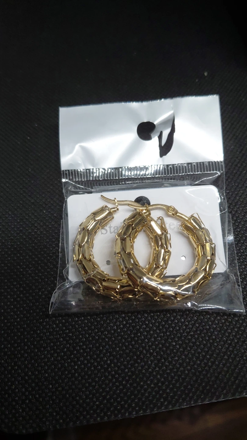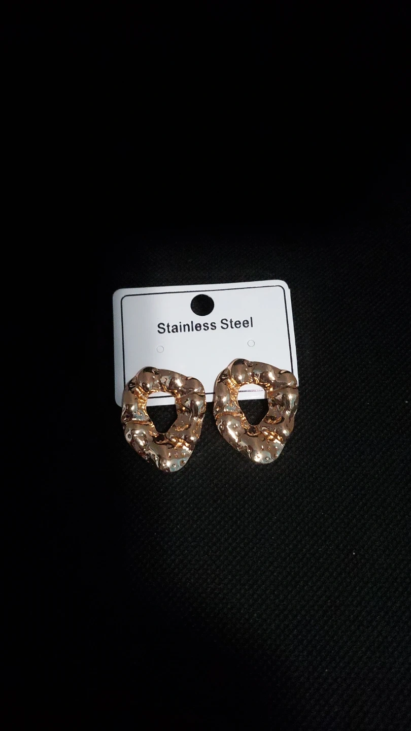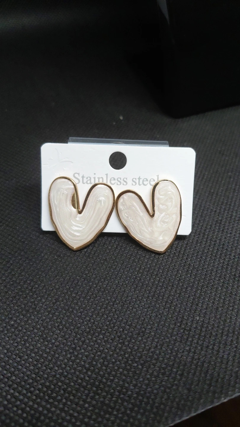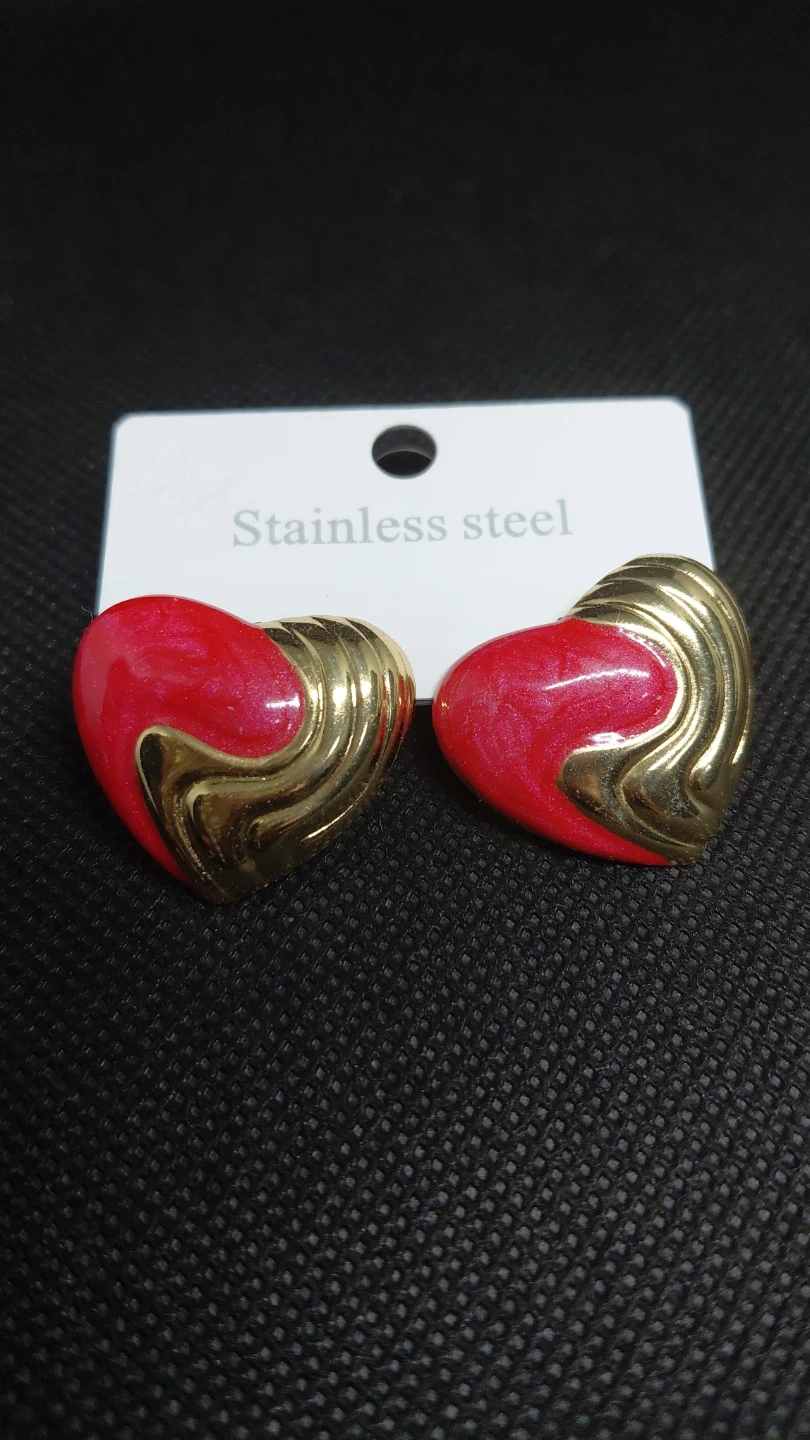 A pair of heart-shaped earrings with red and gold accents. They're made of stainless steel. These earrings add a pop of color to any outfit!