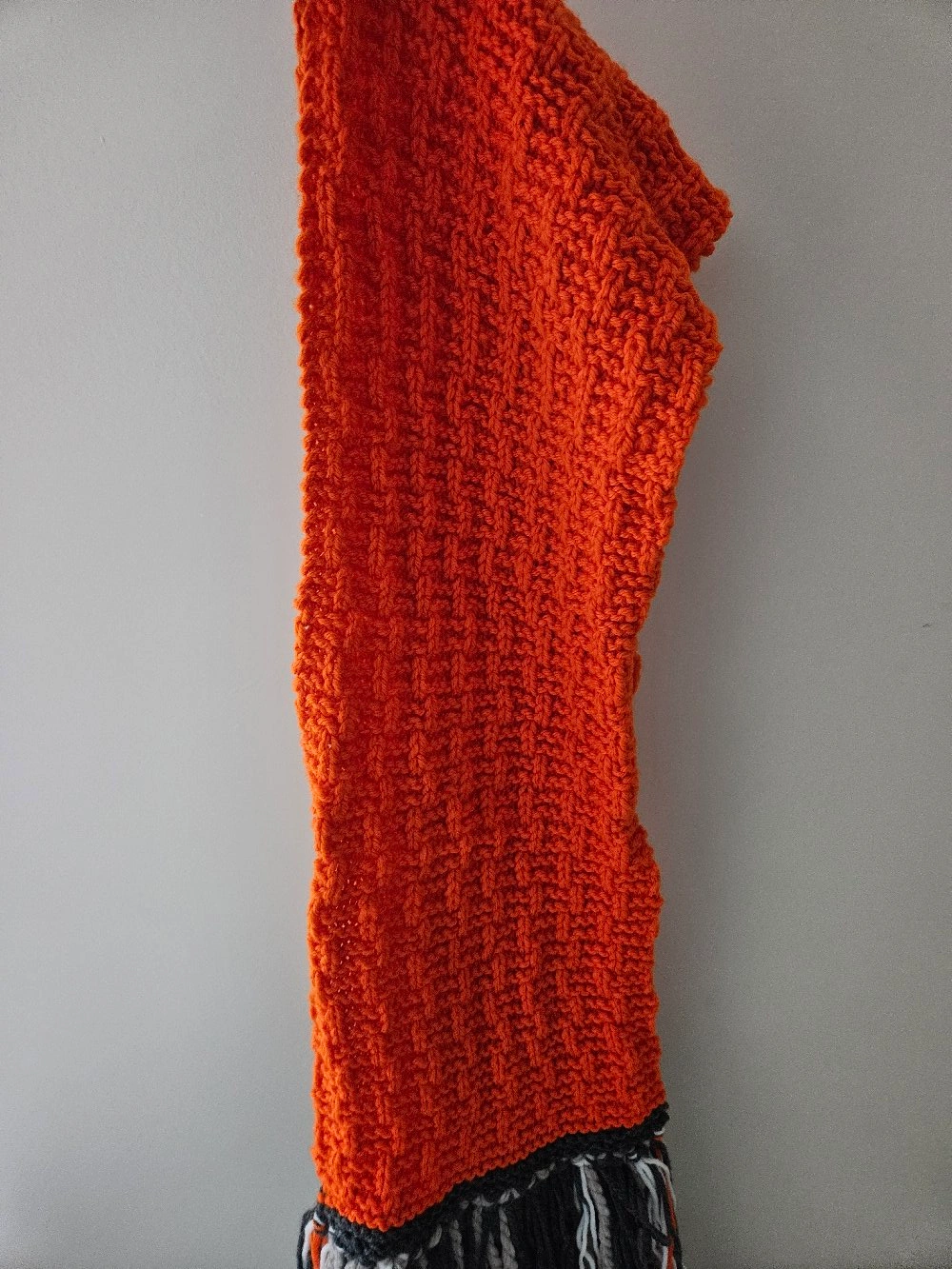 Cozy orange knit scarf with fringes. Perfect for adding a pop of colour and warmth to your winter outfits. It's in great condition and ready for a new home.