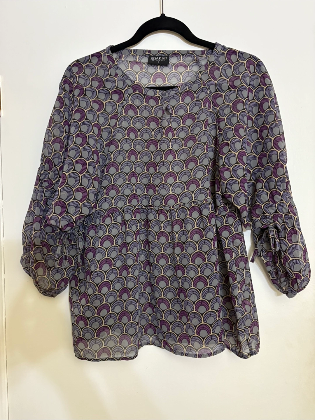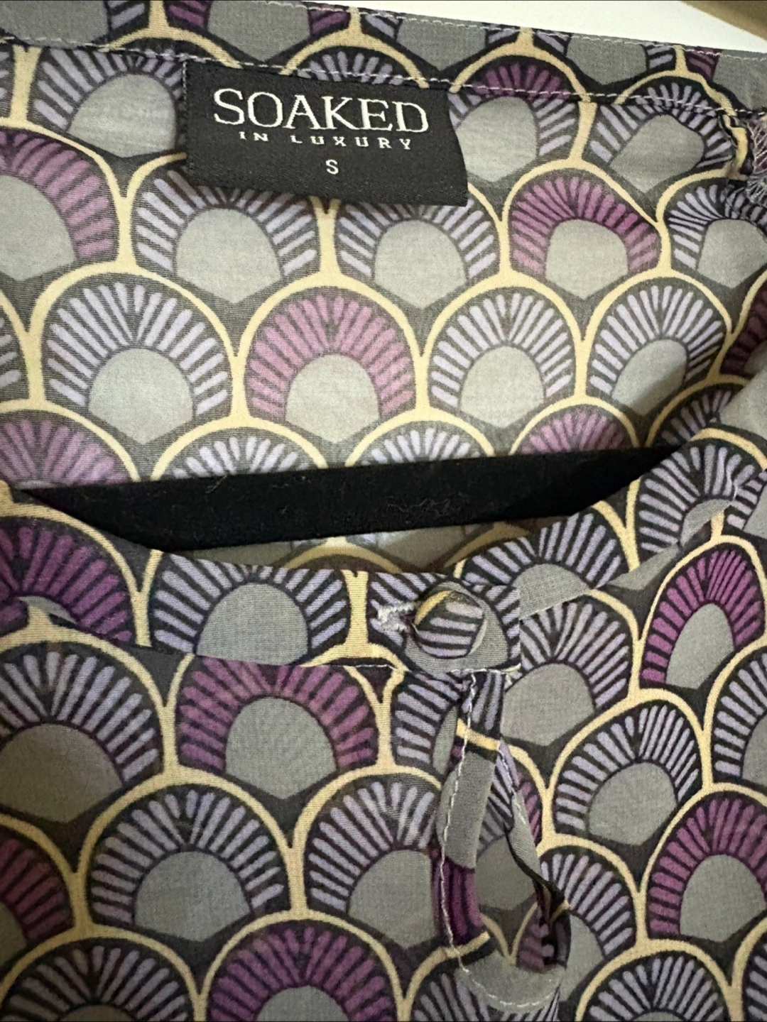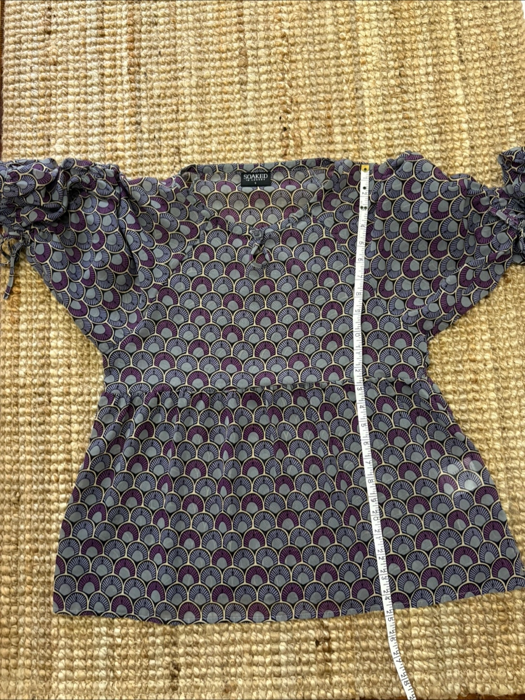 This Soaked in Luxury blouse features a unique purple and grey fan-like pattern. It's made from 100% polyester and is a size small. Perfect for adding a touch of elegance to your wardrobe!