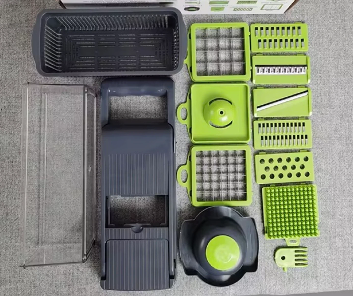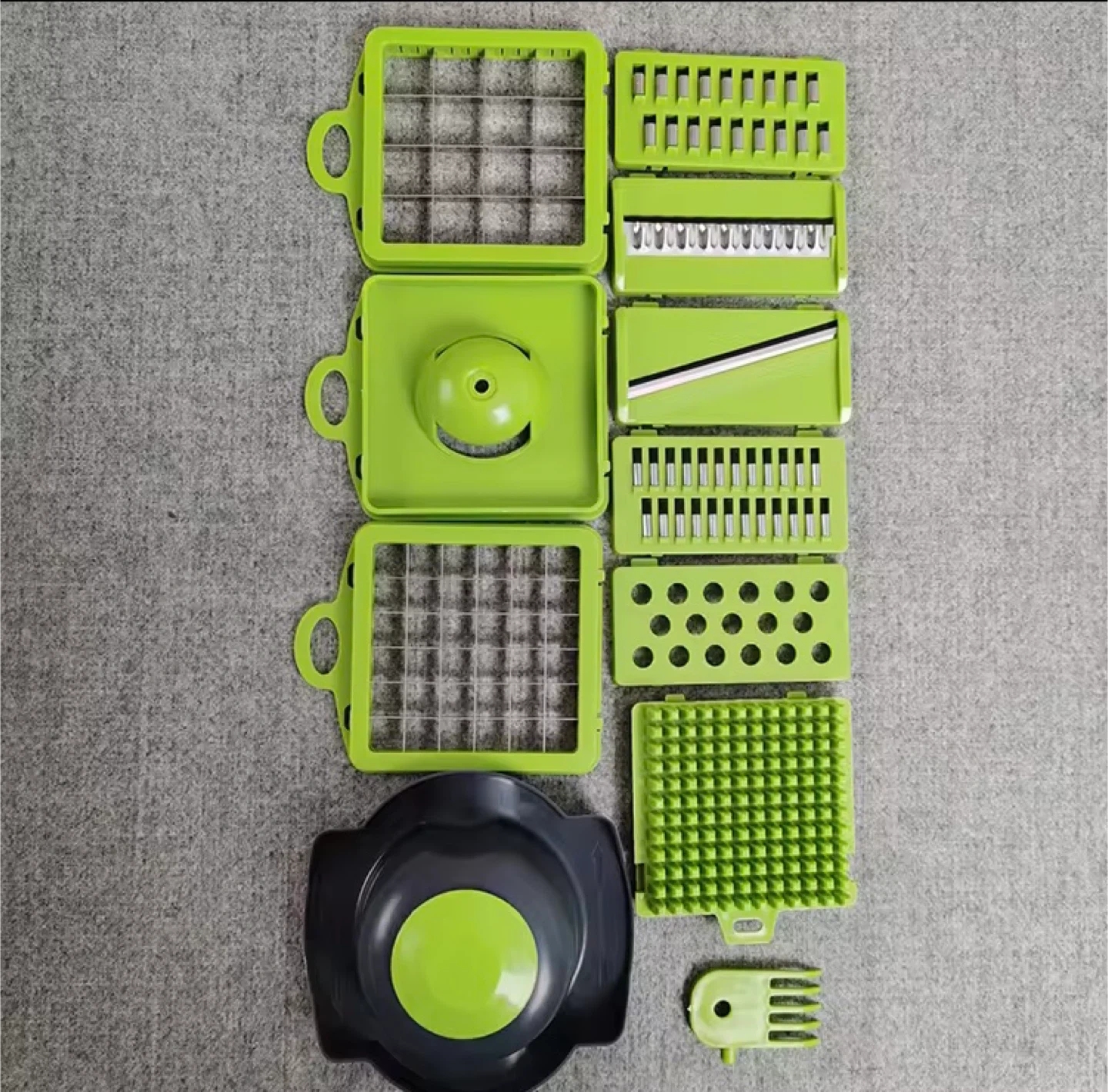 I'm selling a complete vegetable chopper set. It comes with a variety of interchangeable blades and attachments for different cutting styles. It's in great condition and includes all the components you see pictured. This set makes food prep a breeze!