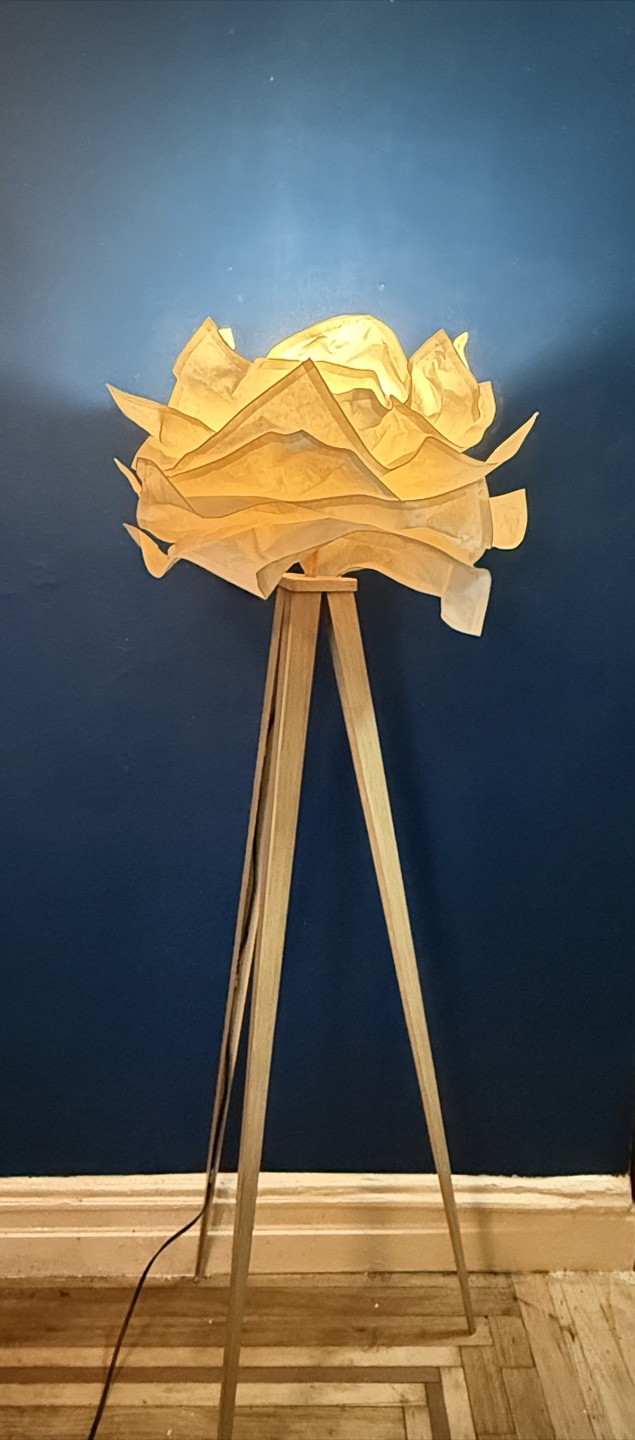 Selling a unique and lightweight floor lamp with an Ikea Krusning cloud/flower-style shade and a wooden tripod base. It adds a warm and stylish touch to any room especially with colored bulbs.
