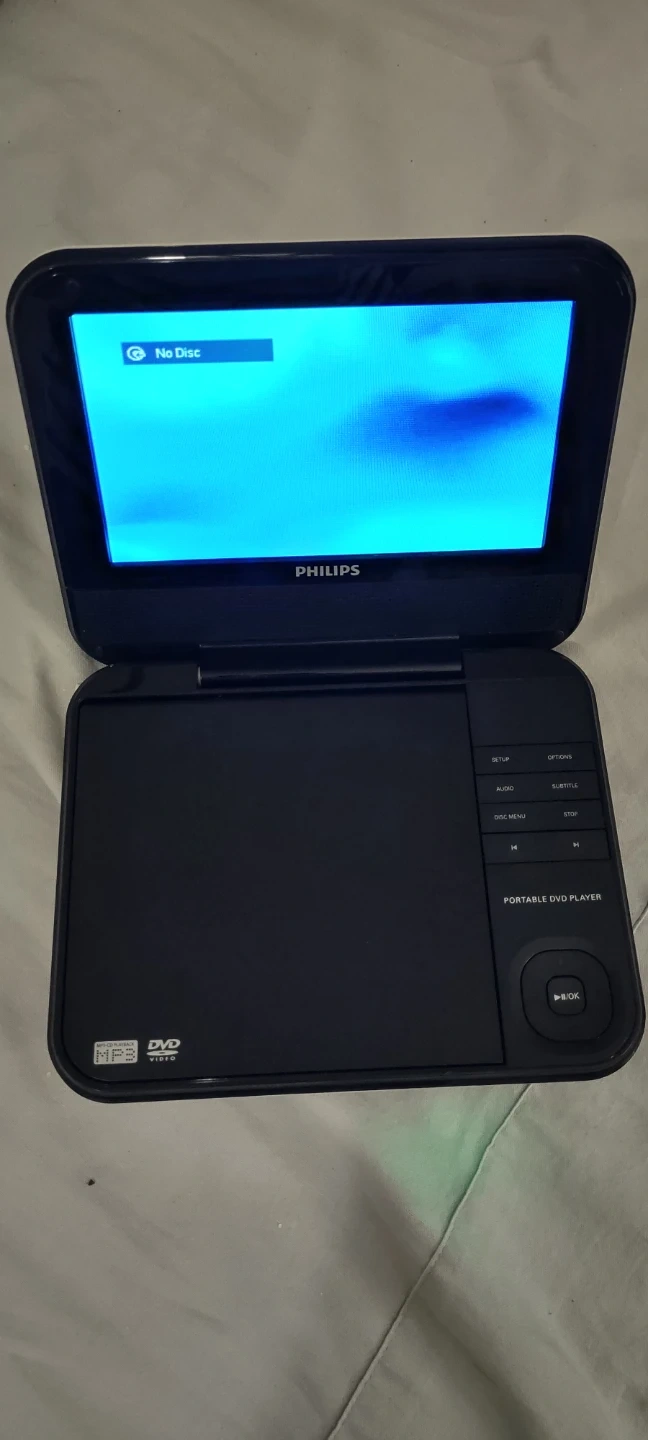 Tested & works great! Before pickup, you can check the product's power and operation in my condo lobby. Selling a Philips PD9012 portable DVD player with 7" dual LCD widescreens. This CD player lets you experience the analog sensibility. The picture quality and sound quality are exceptionally clear and excellent. Simply play your music and movie CDs at home. It's in pristine condition, having only been stored. We're giving away two Transformers CDs for free. It's currently selling for around $59-80 USD on other used goods sites. (just CD player) without box. Enjoy your movies on the go.