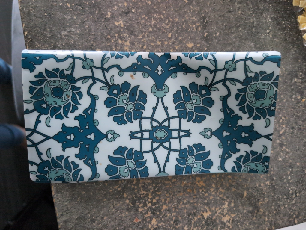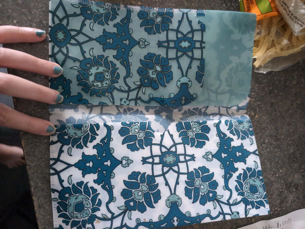 This is a cute pouch with a vibrant floral pattern in shades of blue and white. It's perfect for storing small items like coupons or receipts. The pouch is in great condition and ready for a new home