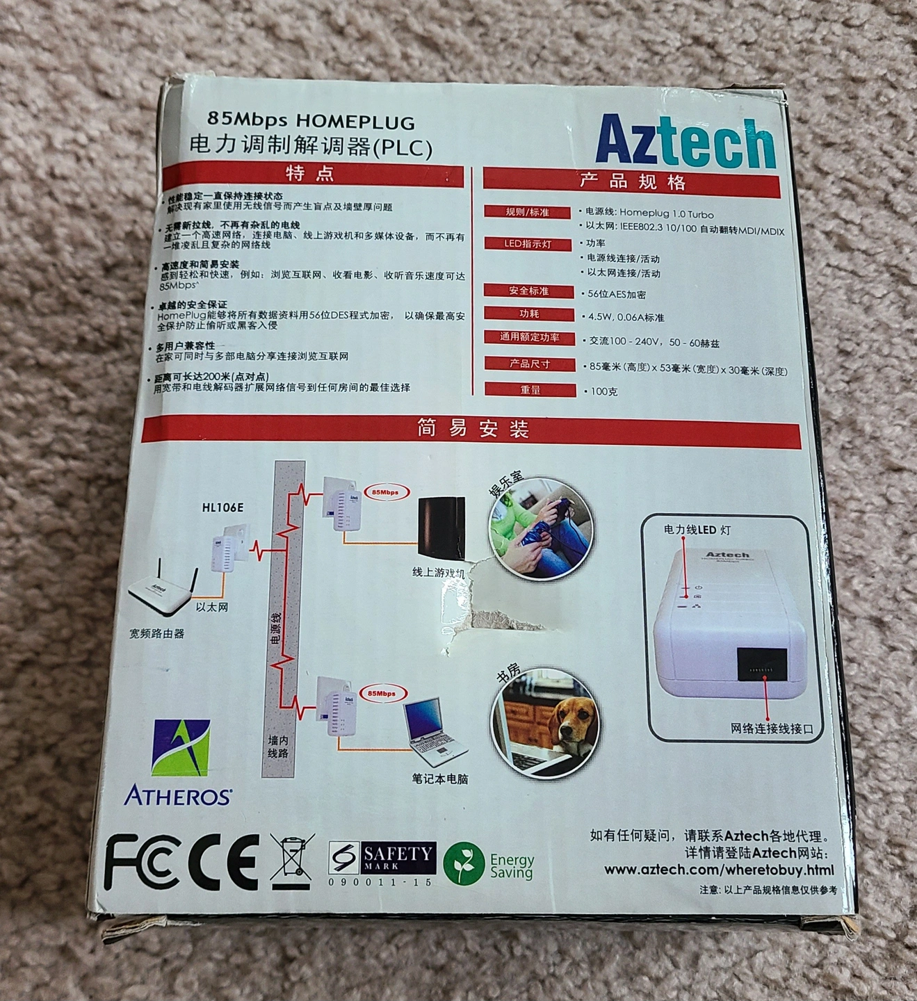 Aztech HL106E Powerline Adapter, HomePlug Ethernet Networking, 85Mbps, open box, unused.