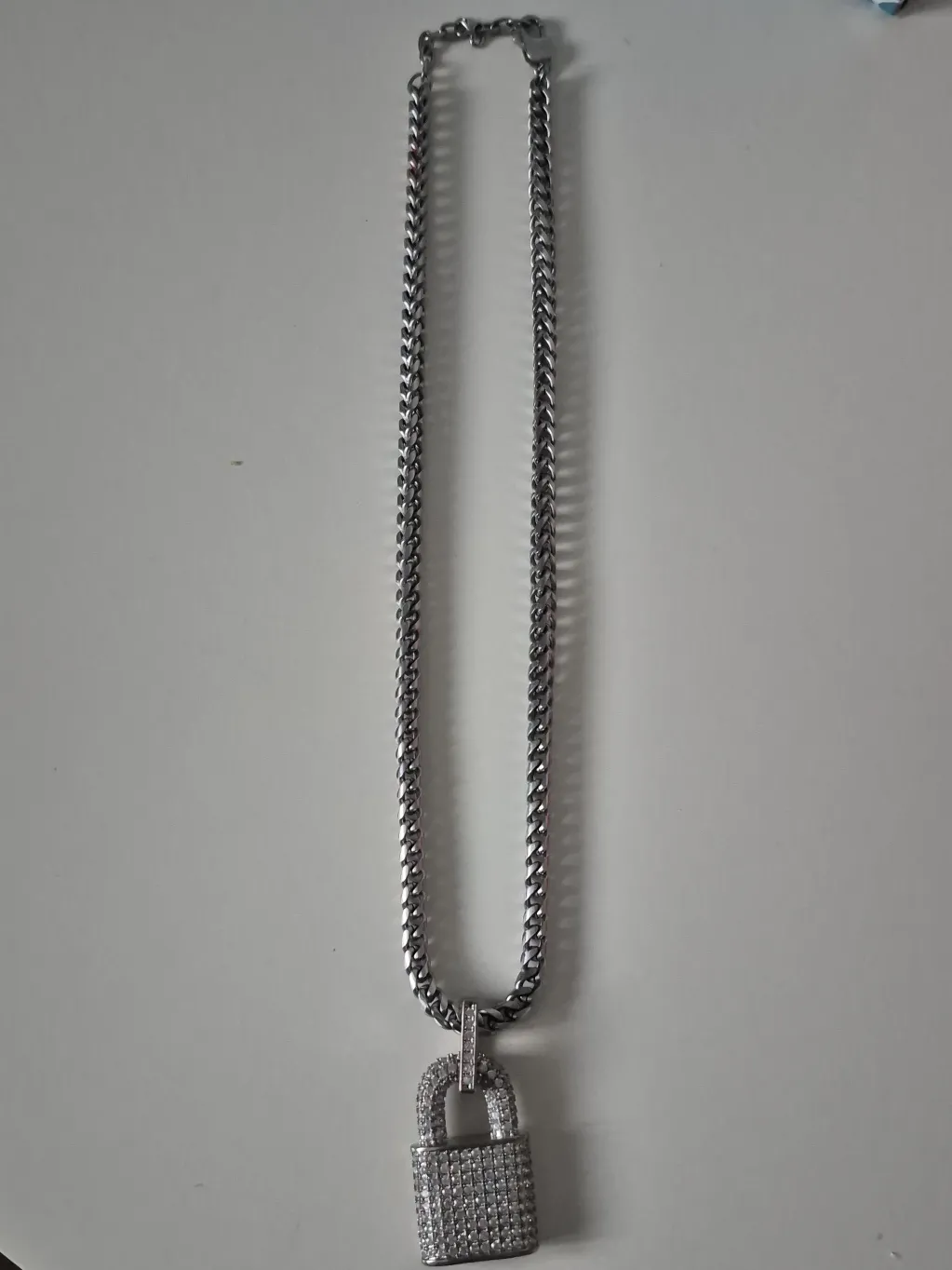 Selling a silver chain necklace with a lock pendant. The chain is a wheat style and the lock is encrusted with stones. Great for adding some sparkle to your outfit!