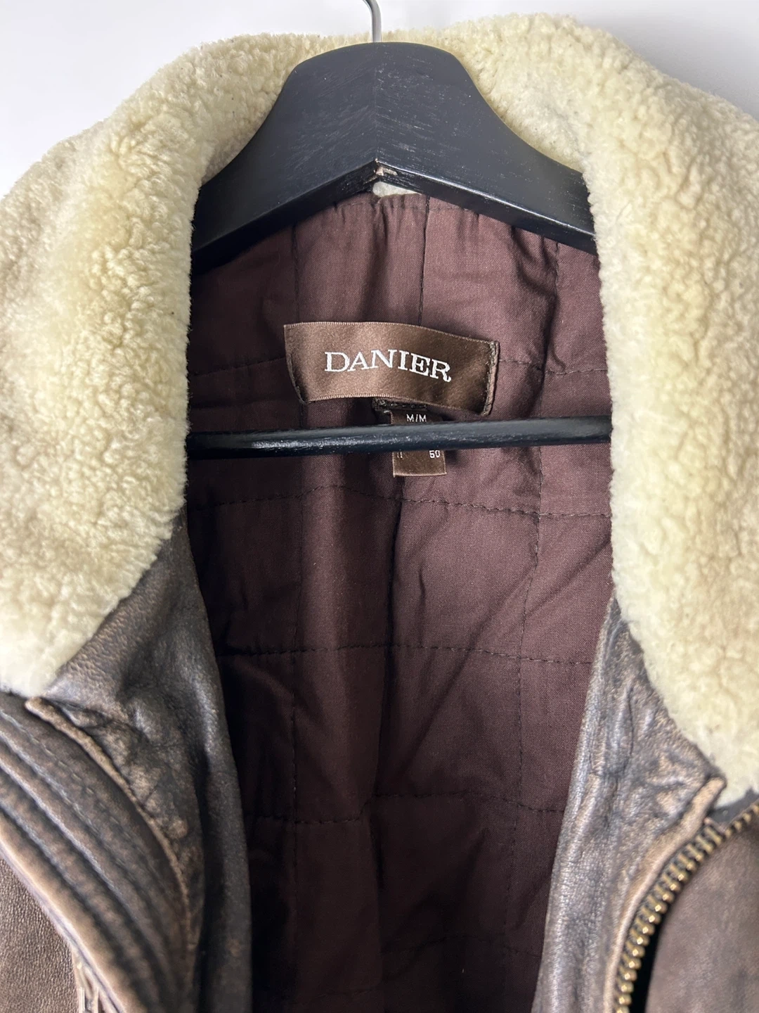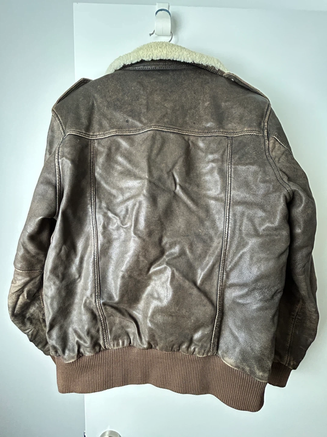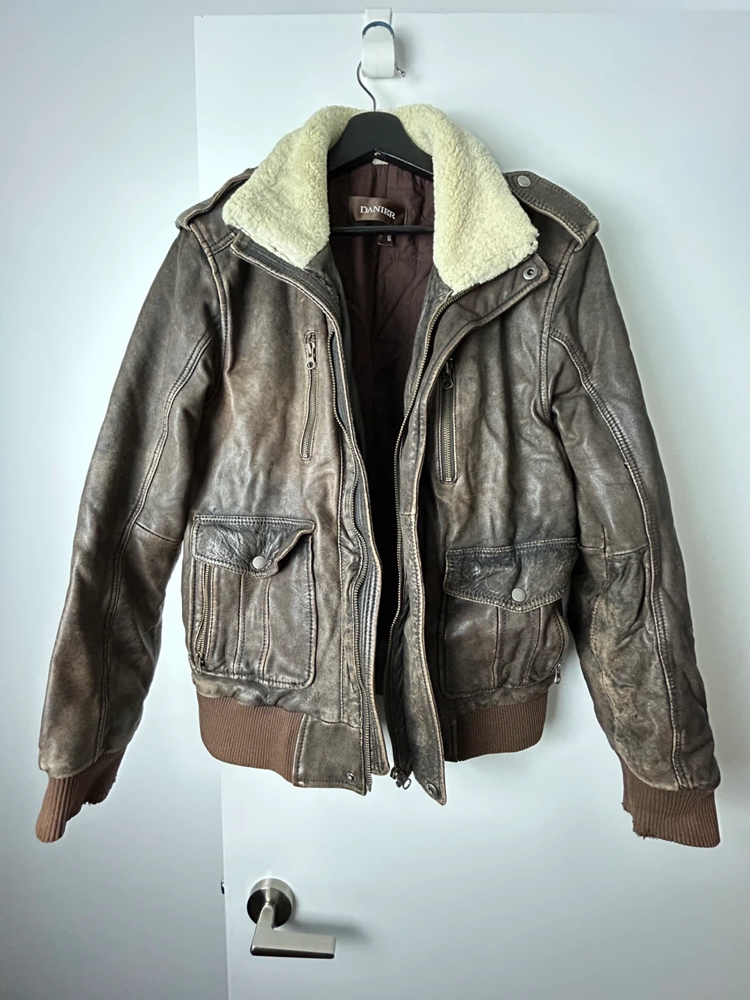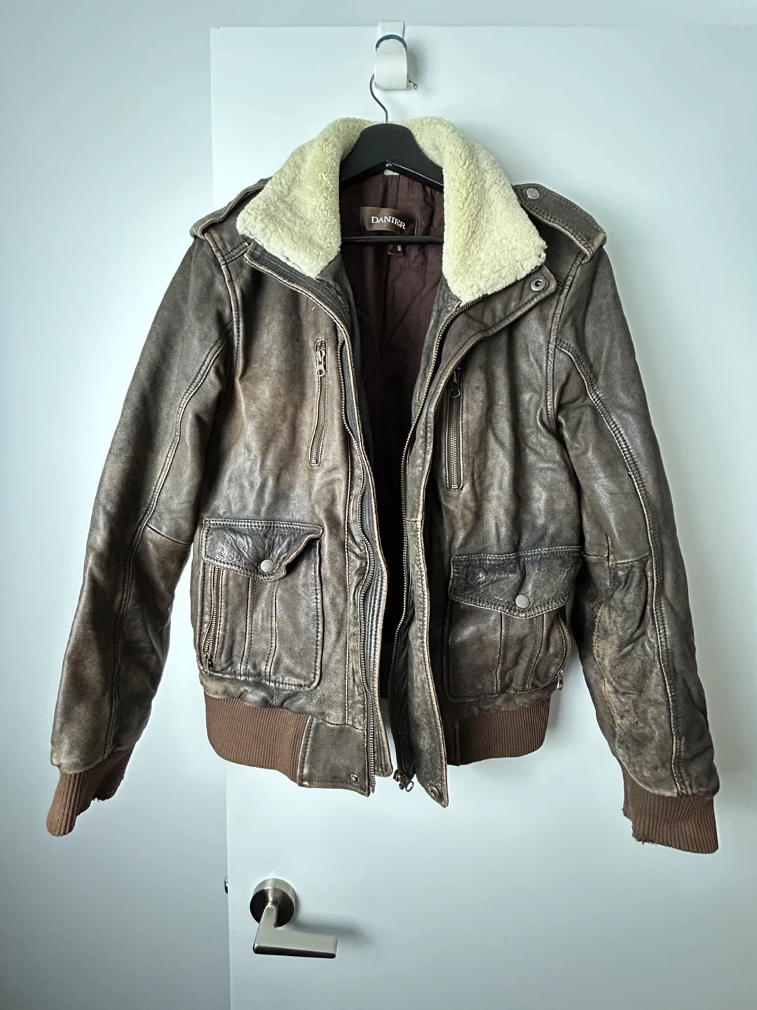 Selling a Danier leather bomber jacket in size M. It's a durable and stylish jacket with a slightly vintage feel. The jacket features a shearling collar and a worn-in look, adding to its character. It has multiple pockets for convenience. A great addition to any wardrobe!