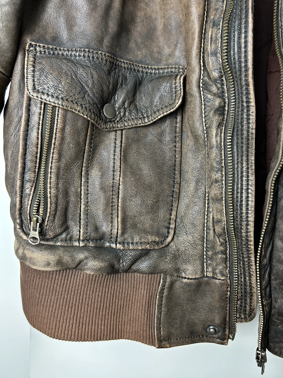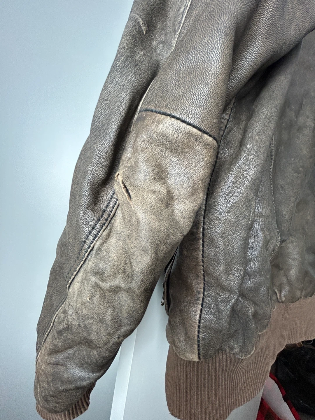 There is a small tear on one elbow, pictured. This has been reflected in the significant discount, as this jacket is genuine leather and retailed for over $400