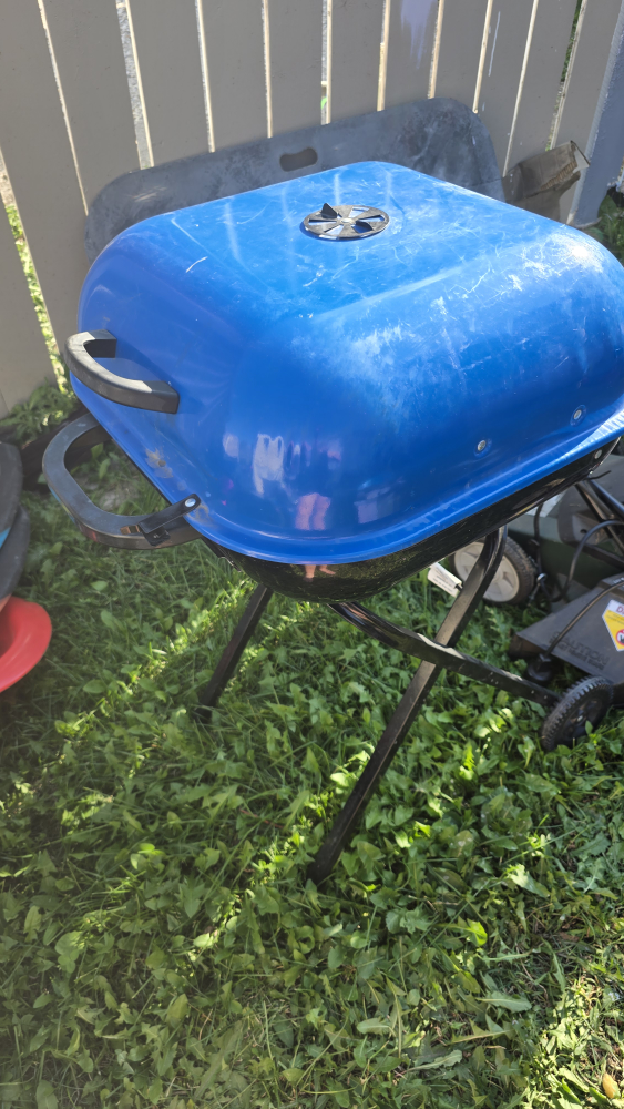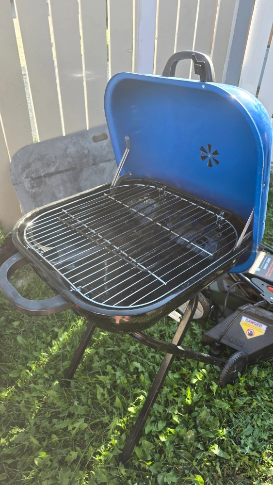 Selling my portable blue charcoal BBQ grill, perfect for small spaces or taking on the go! It's in great condition and ready for your next cookout. It's lightweight and easy to move around, making it a convenient option for any outdoor gathering