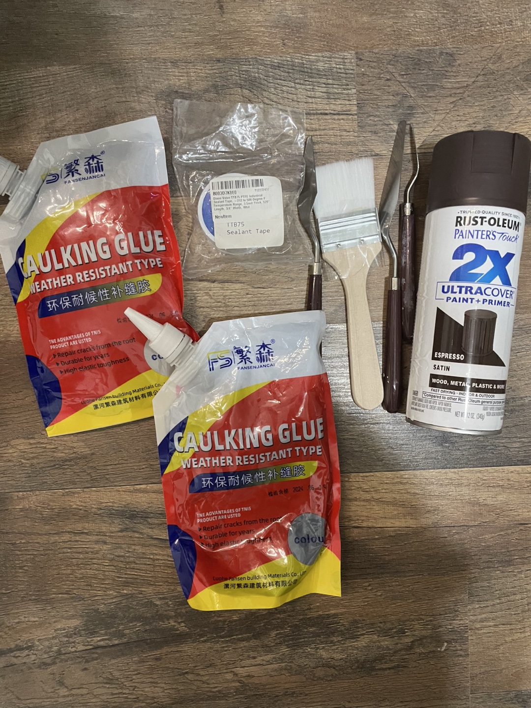 I have some caulking glue, sealant tape, paint, and brushes for sale. The caulking glue is weather resistant. The paint is Rust-Oleum Painter's Touch 2X Ultra Cover in Espresso.
