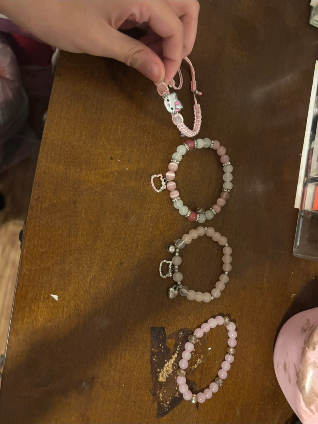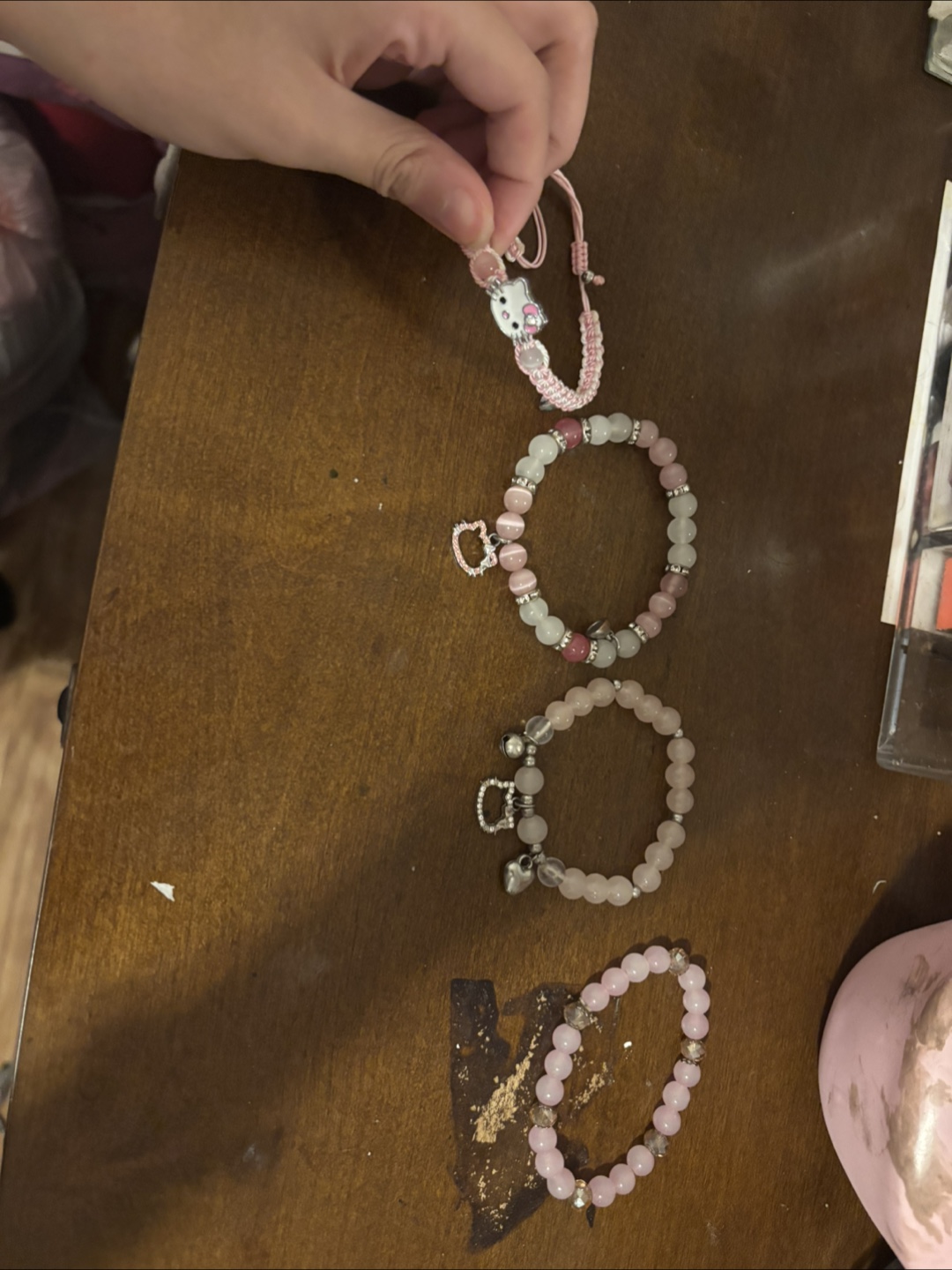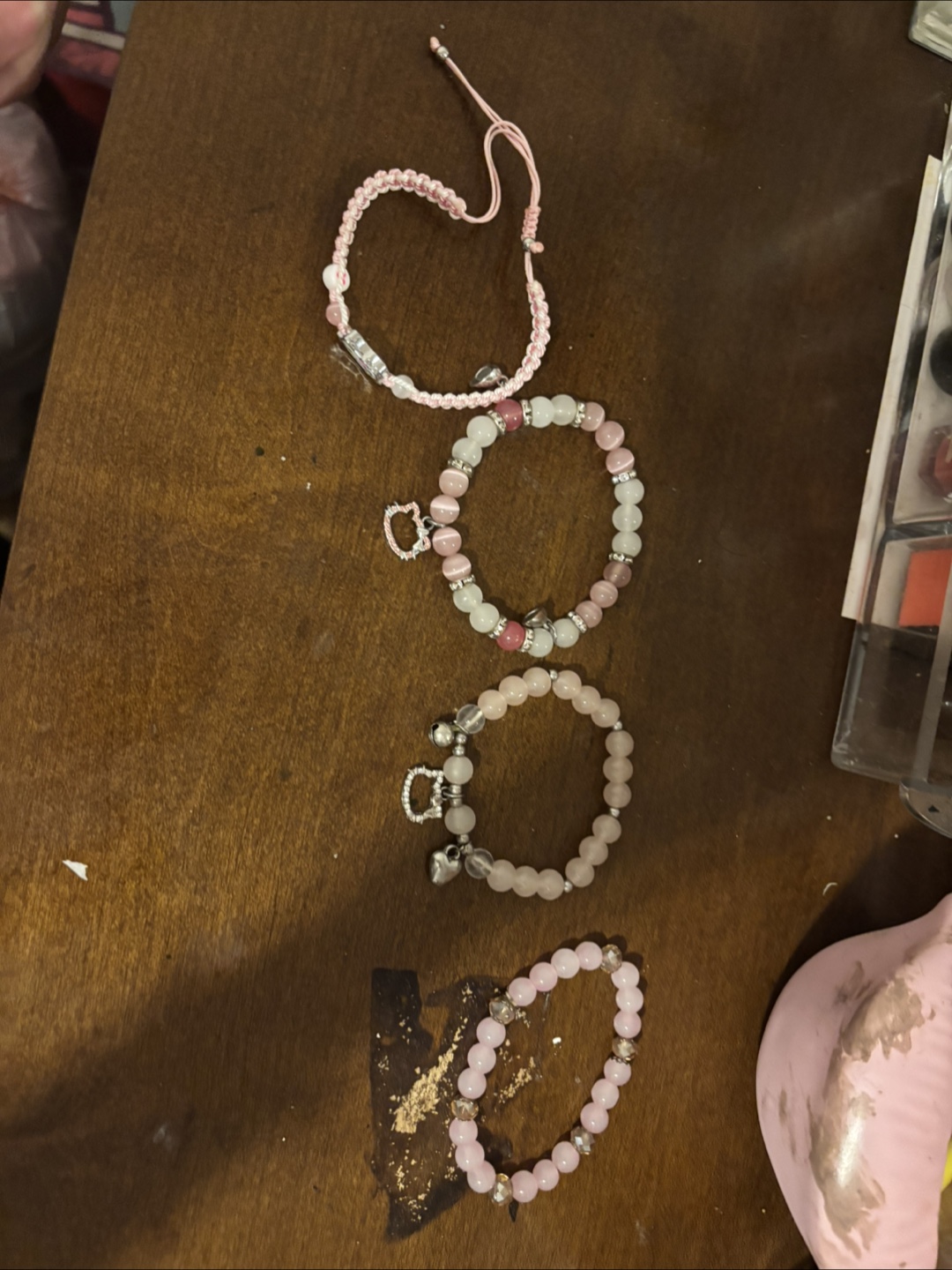 Selling a set of four handmade pink beaded bracelets. They're all in great condition and ready for a new home! Perfect for adding a touch of charm to any outfit.