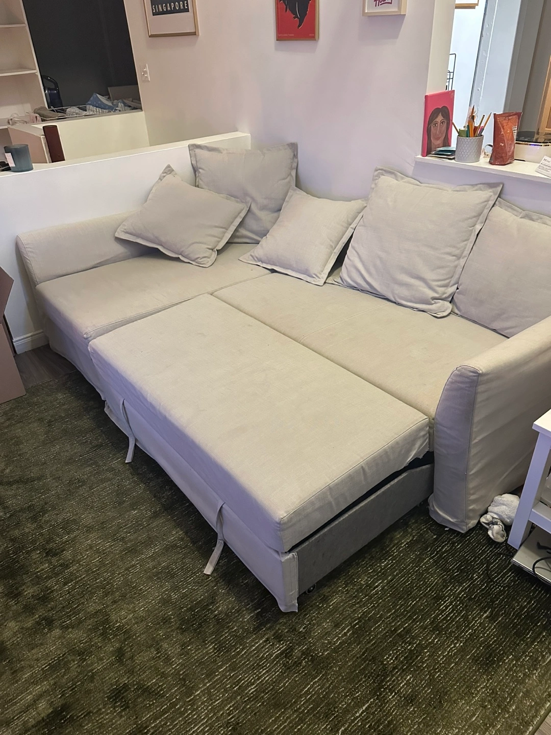 Selling an IKEA Holmsund sleeper sectional sofa! It's in great condition and ready for a new home. The sofa can be arranged as a left or right facing sectional, and it easily converts into a bed. It also has storage under the chaise for bedding or other items. Dimensions are included in the photos!