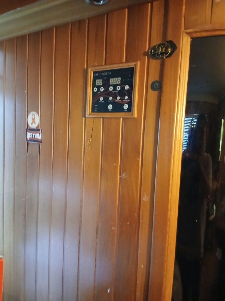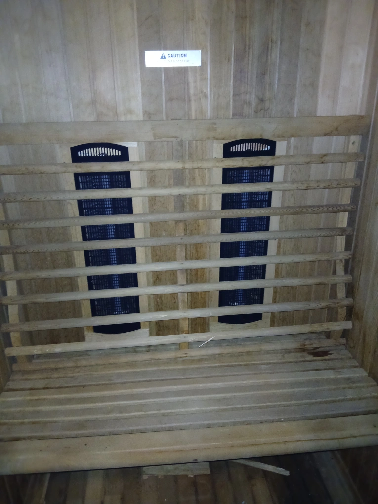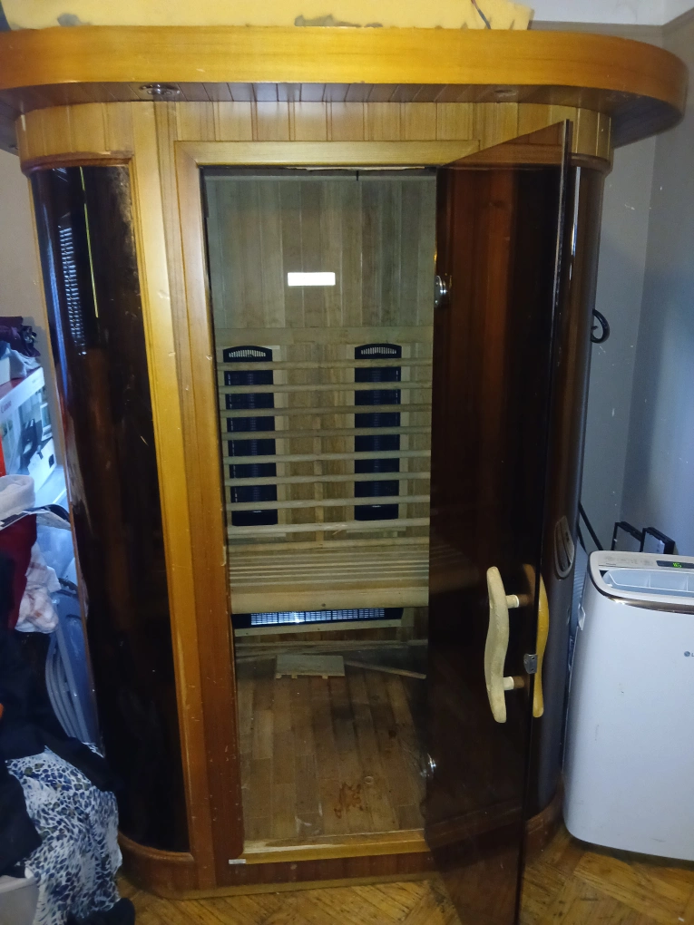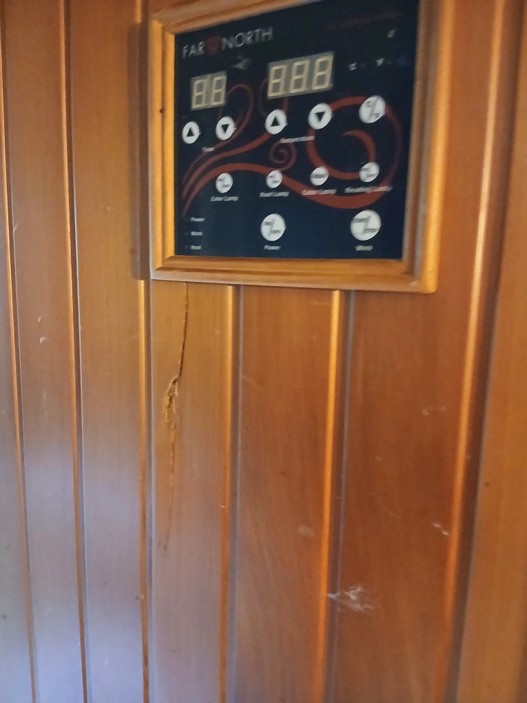 Selling a used Far North Saunas home sauna. It has a digital control panel for adjusting temperature and settings. There are some signs of wear and tear, including a crack in the wood paneling and some damage to the door frame, as shown in the photos.