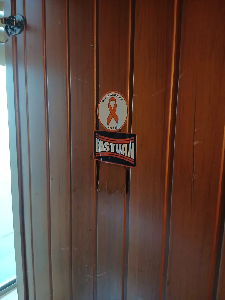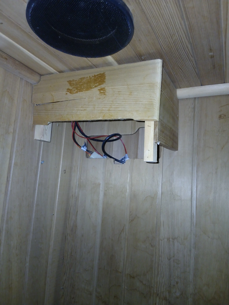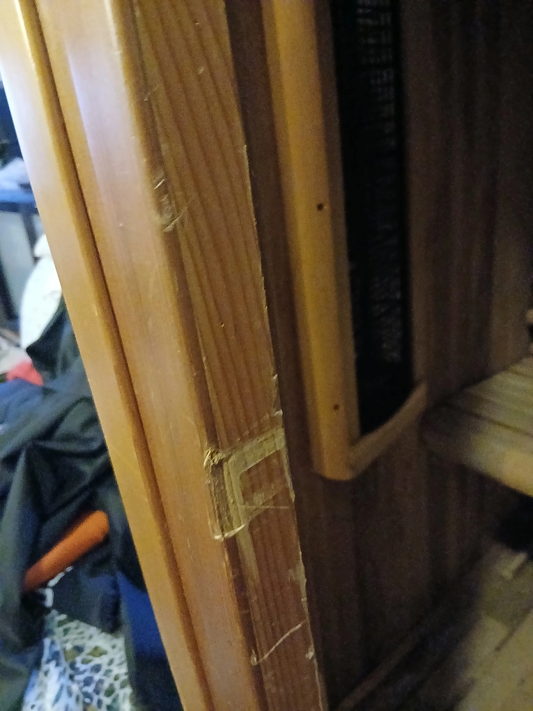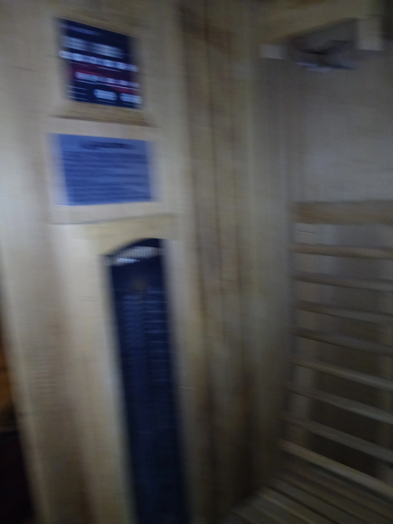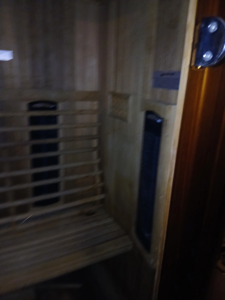 Selling a used Far North Saunas home sauna. It has a digital control panel for adjusting temperature and settings. There are some signs of wear and tear, including a crack in the wood paneling and some damage to the door frame, as shown in the photos.