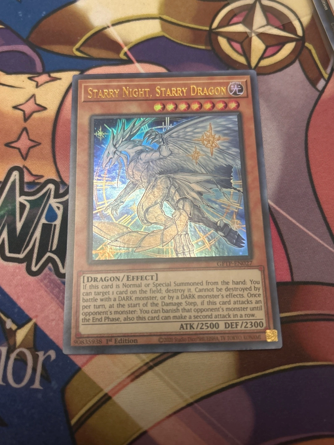 Selling a Starry Night, Starry Dragon Yugioh card. It's a Dragon/Effect monster card. The card has an attack of 2500 and a defense of 2300. This is a 1st Edition card!