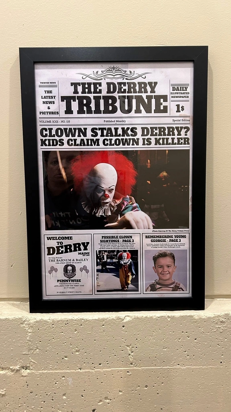Framed poster of The Derry Tribune newspaper! It features the headline "Clown Stalks Derry? Kids Claim Clown is Killer" and other articles related to the fictional town of Derry from the movie IT. A fun piece for any horror fan. 12 x 18 inches