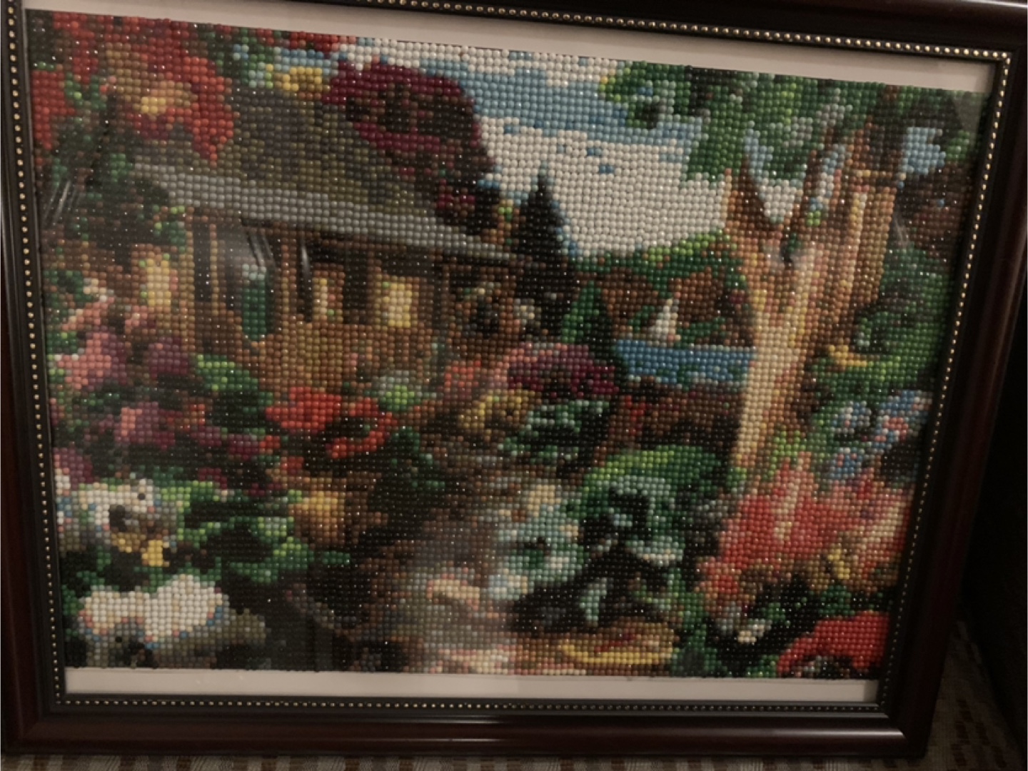 This is a finished diamond art painting in a frame. It depicts a colourful garden scene with a house and pond. It is in great condition and ready to hang!