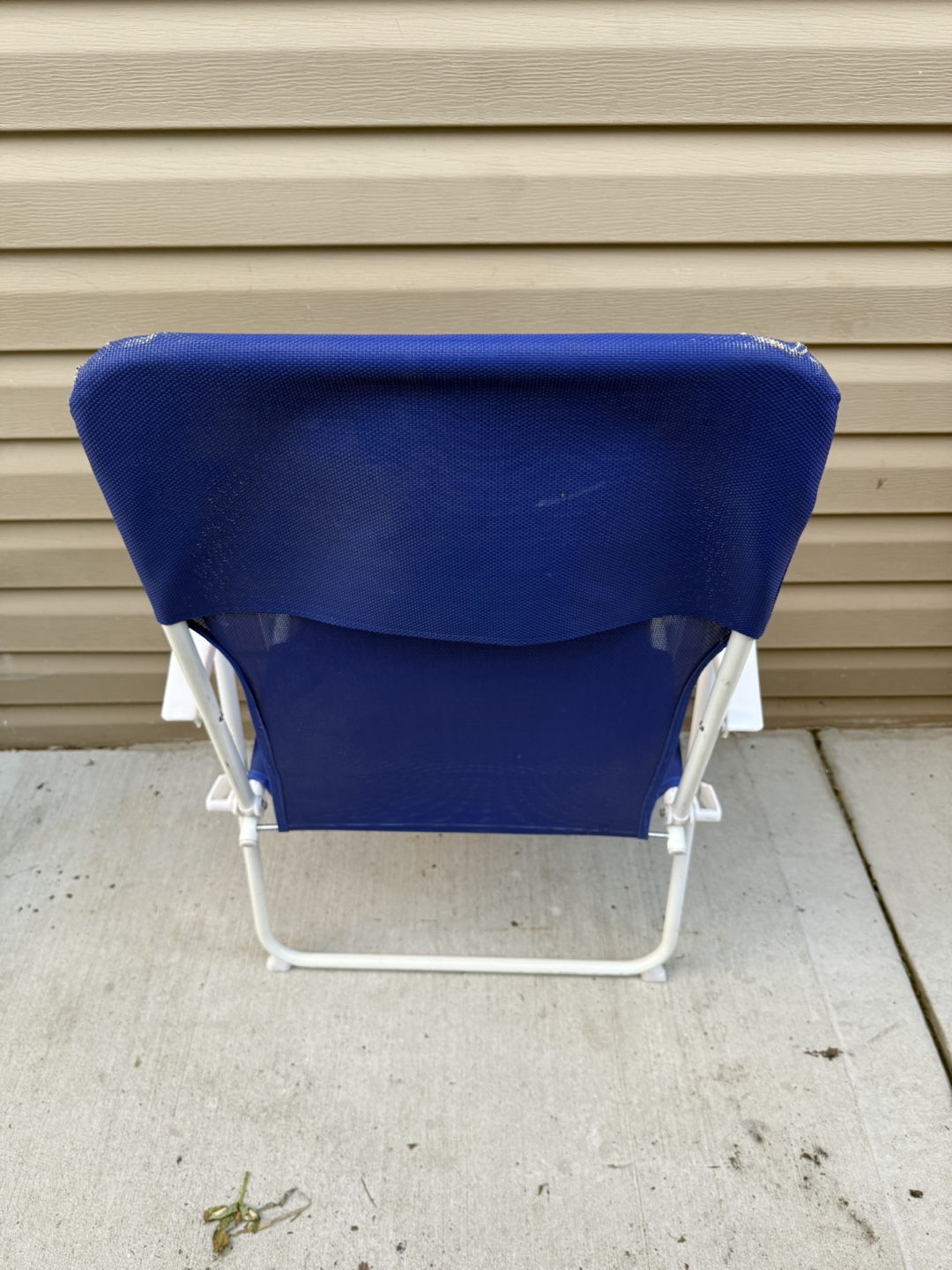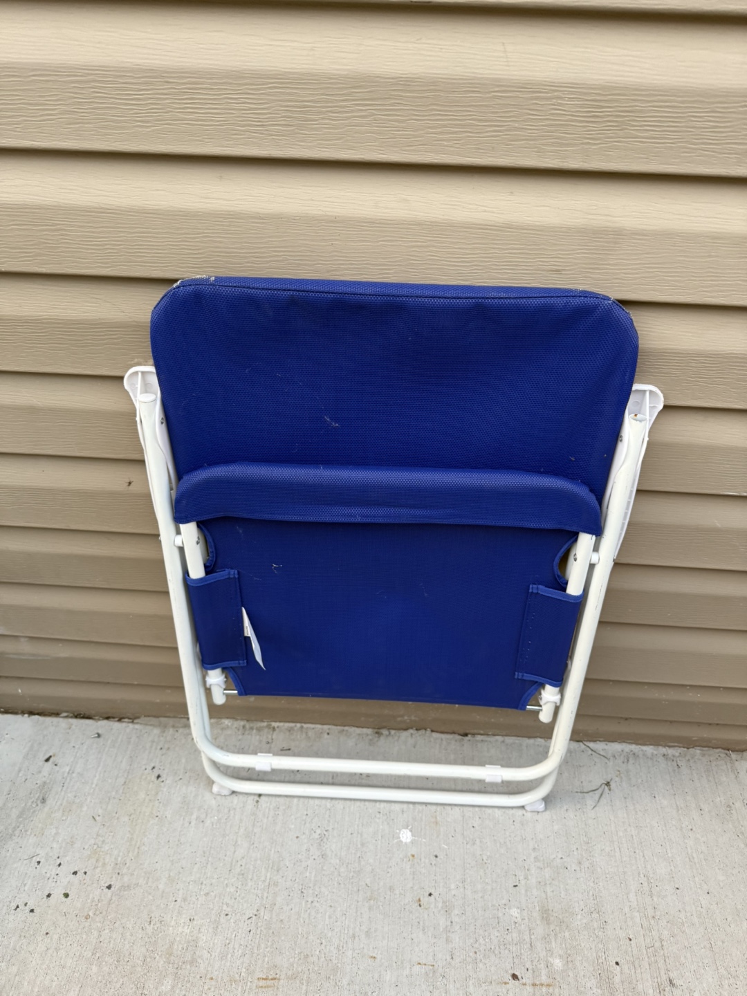 Selling a blue folding beach chair. It's in good condition and perfect for taking to the beach or park. It's lightweight and easy to carry, making it great for outdoor relaxation