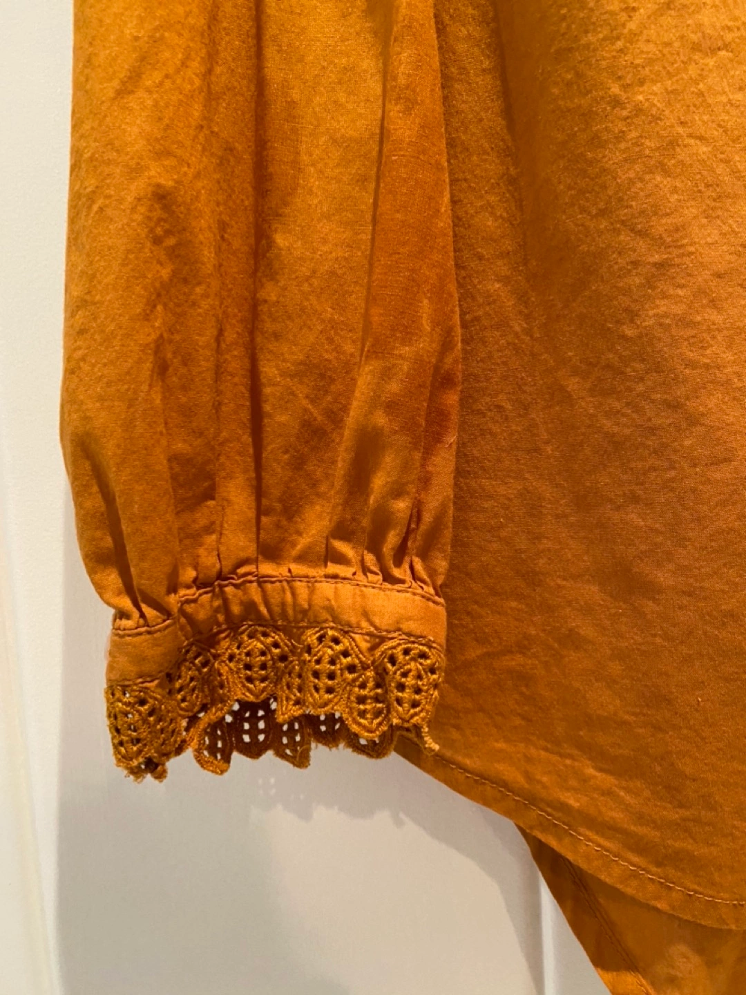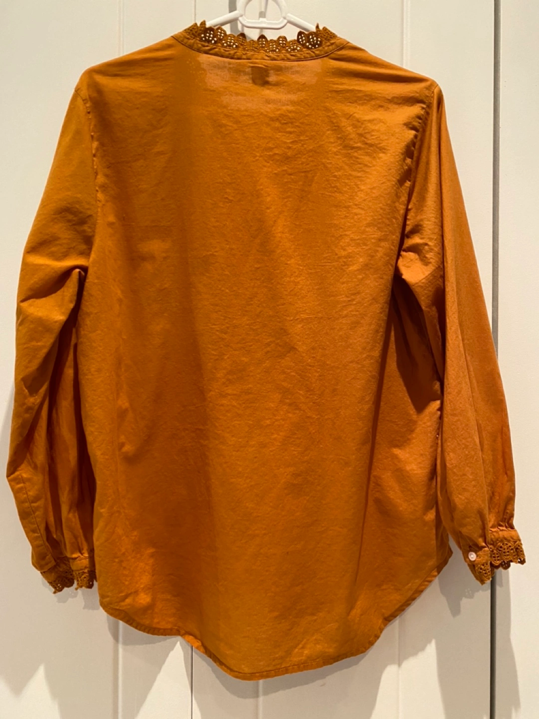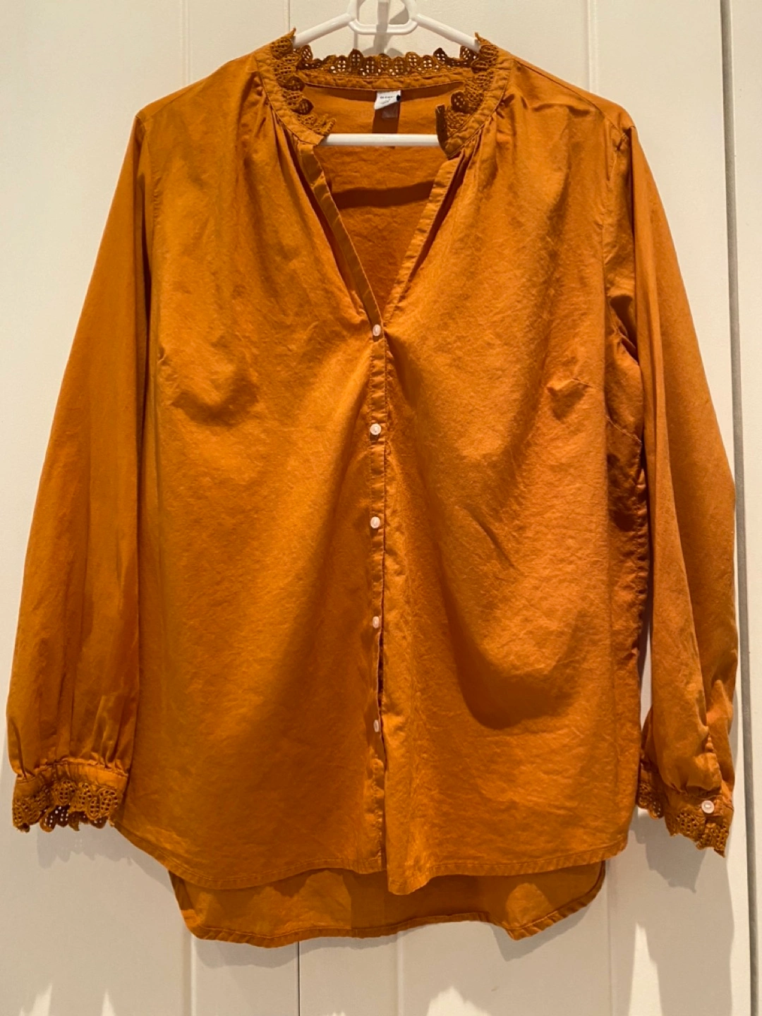 Blouse-y button-up with a v-neck, bust darts and lace trim on collar & cuffs. Rich goldenrod colour. Generous fit.
