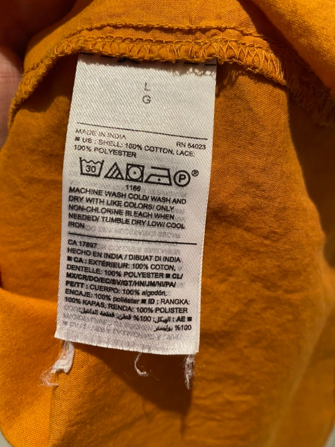 Size L. 💯 cotton shirt, 💯 polyester lace.