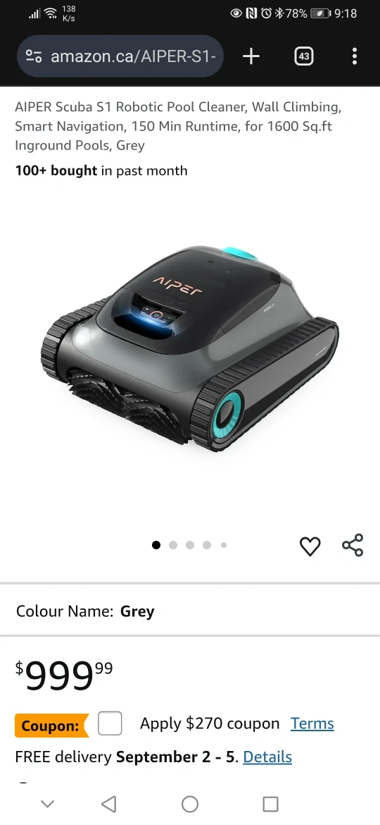Selling an AIPER Scuba S1 robotic pool cleaner in grey! It features wall climbing, smart navigation, and a 150-minute runtime, perfect for inground pools up to 1600 sq.ft. This cleaner is super handy for keeping your pool sparkling clean.