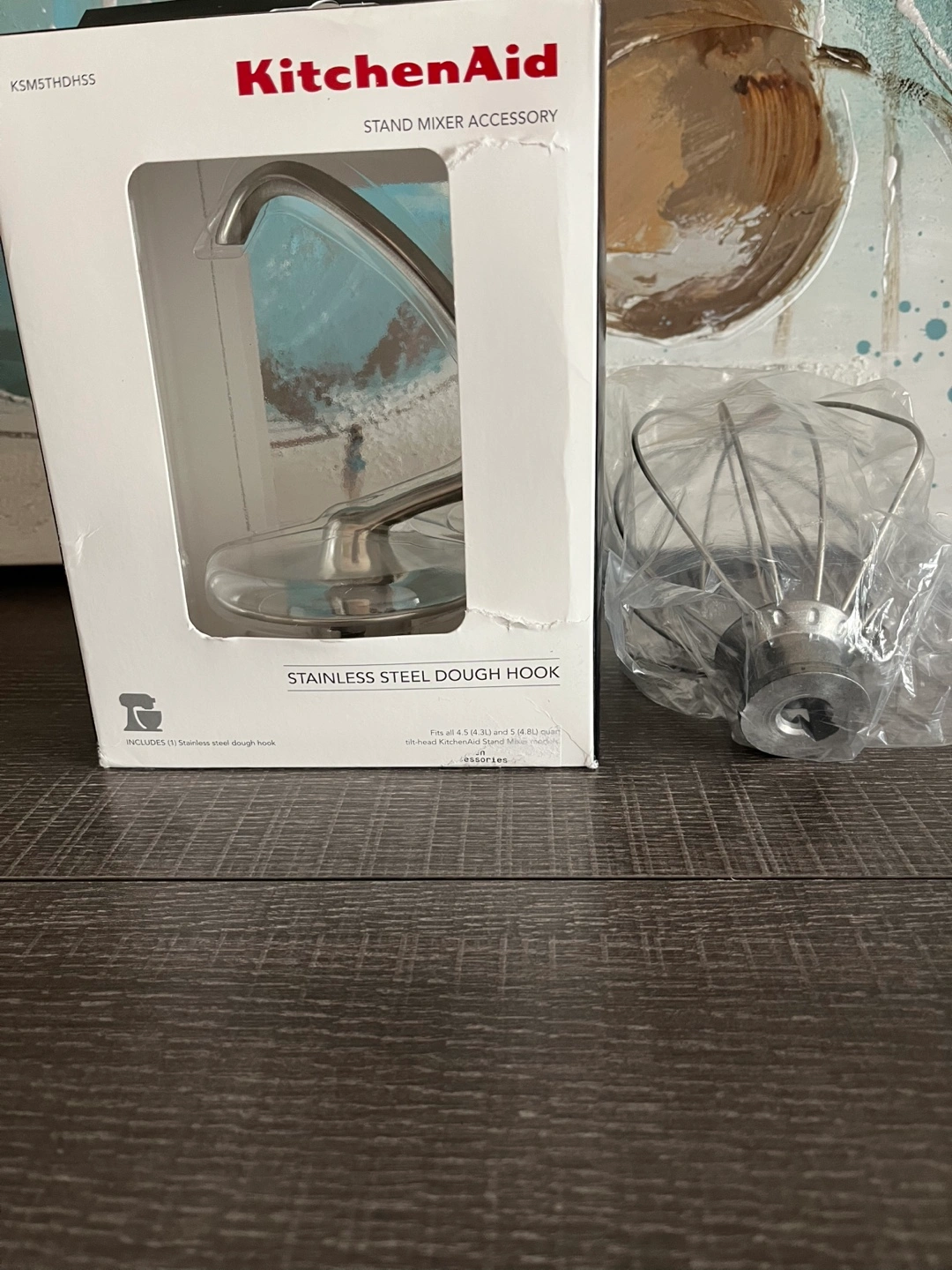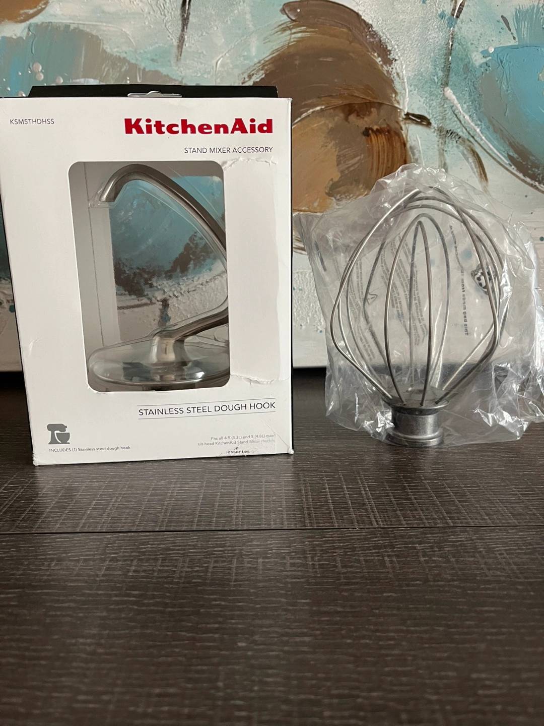 Selling a brand new KitchenAid stainless steel dough hook attachment for stand mixers. 5 quart. It's still in its original packaging and has never been used! Perfect for making bread or pizza dough. Also includes a used whisk attachment. Price is for both